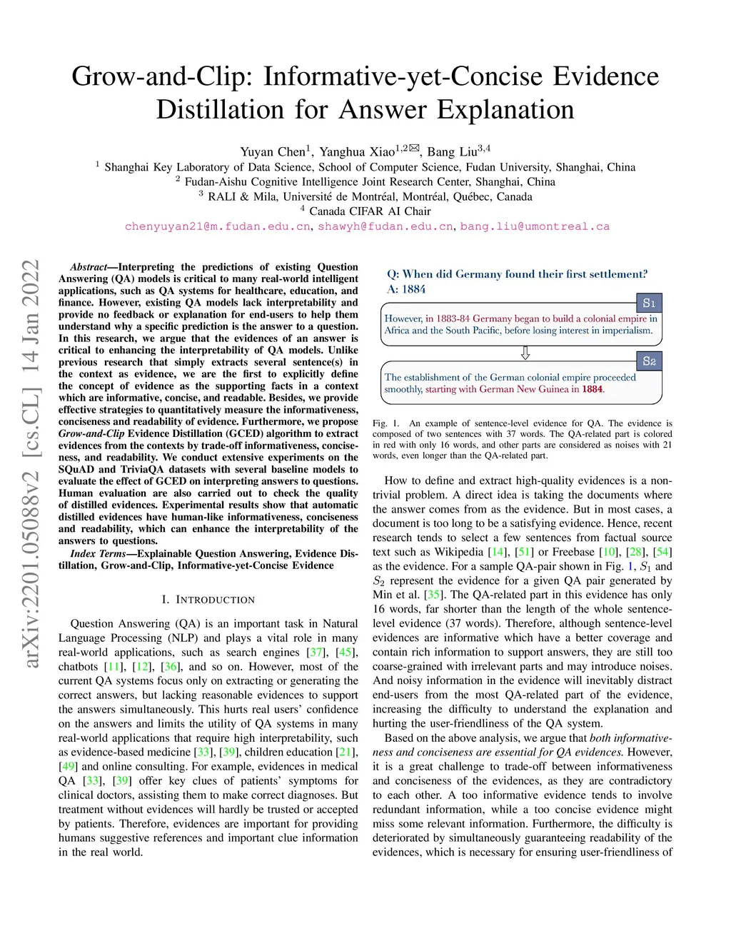 Interpreting the predictions of existing Question Answering (QA) models is critical to many real-world intelligent applications, such as QA systems for healthcare, education, and finance. However, existing QA models lack interpretability and provide no feedback or explanation for end-users to help them understand why a specific prediction is the answer to a question. In this research, we argue that the evidences of an answer is critical to enhancing the interpretability of QA models. Unlike previous research that simply extracts several sentence(s) in the context as evidence, we are the first to explicitly define the concept of evidence as the supporting facts in a context which are informative, concise, and readable. Besides, we provide effective strategies to quantitatively measure the informativeness, conciseness and readability of evidence. Furthermore, we propose Grow-and-Clip Evidence Distillation (GCED) algorithm to extract evidences from the contexts by trade-off informativeness, conciseness, and readability. We conduct extensive experiments on the SQuAD and TriviaQA datasets with several baseline models to evaluate the effect of GCED on interpreting answers to questions. Human evaluation are also carried out to check the quality of distilled evidences. Experimental results show that automatic distilled evidences have human-like informativeness, conciseness and readability, which can enhance the interpretability of the answers to questions.