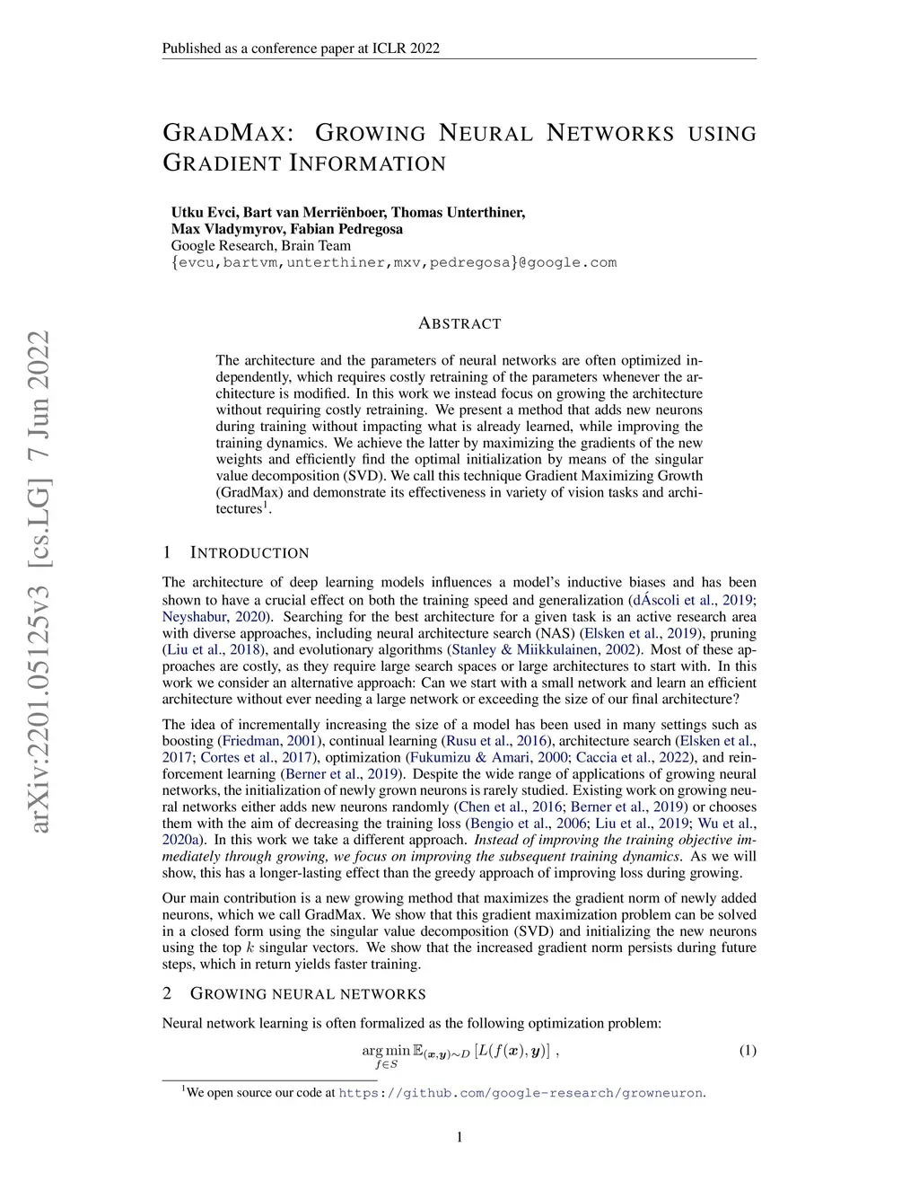 The architecture and the parameters of neural networks are often optimized independently, which requires costly retraining of the parameters whenever the architecture is modified. In this work we instead focus on growing the architecture without requiring costly retraining. We present a method that adds new neurons during training without impacting what is already learned, while improving the training dynamics. We achieve the latter by maximizing the gradients of the new weights and find the optimal initialization efficiently by means of the singular value decomposition (SVD). We call this technique Gradient Maximizing Growth (GradMax) and demonstrate its effectiveness in variety of vision tasks and architectures.
