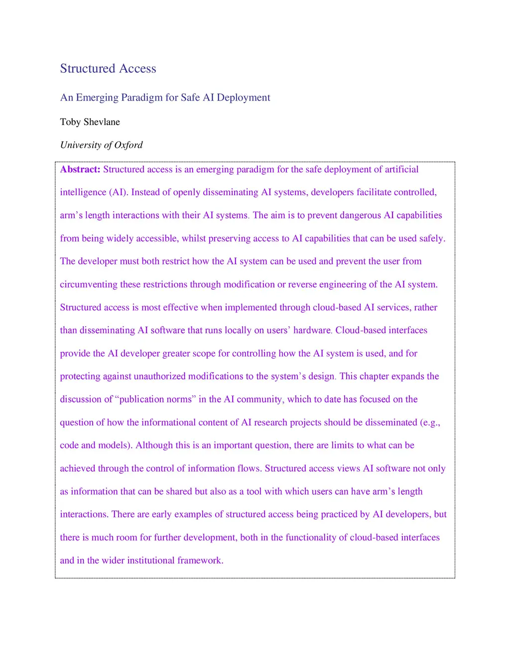 Structured access is an emerging paradigm for the safe deployment of artificial intelligence (AI). Instead of openly disseminating AI systems, developers facilitate controlled, arm's length interactions with their AI systems. The aim is to prevent dangerous AI capabilities from being widely accessible, whilst preserving access to AI capabilities that can be used safely. The developer must both restrict how the AI system can be used, and prevent the user from circumventing these restrictions through modification or reverse engineering of the AI system. Structured access is most effective when implemented through cloud-based AI services, rather than disseminating AI software that runs locally on users' hardware. Cloud-based interfaces provide the AI developer greater scope for controlling how the AI system is used, and for protecting against unauthorized modifications to the system's design. This chapter expands the discussion of "publication norms" in the AI community, which to date has focused on the question of how the informational content of AI research projects should be disseminated (e.g., code and models). Although this is an important question, there are limits to what can be achieved through the control of information flows. Structured access views AI software not only as information that can be shared but also as a tool with which users can have arm's length interactions. There are early examples of structured access being practiced by AI developers, but there is much room for further development, both in the functionality of cloud-based interfaces and in the wider institutional framework.