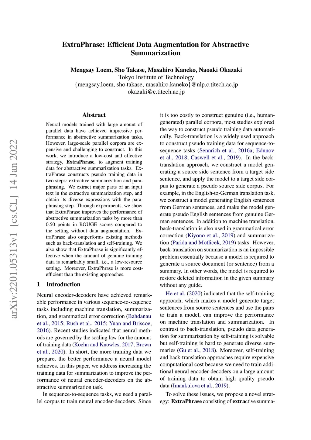 ExtraPhrase: Efficient Data Augmentation for Abstractive Summarization