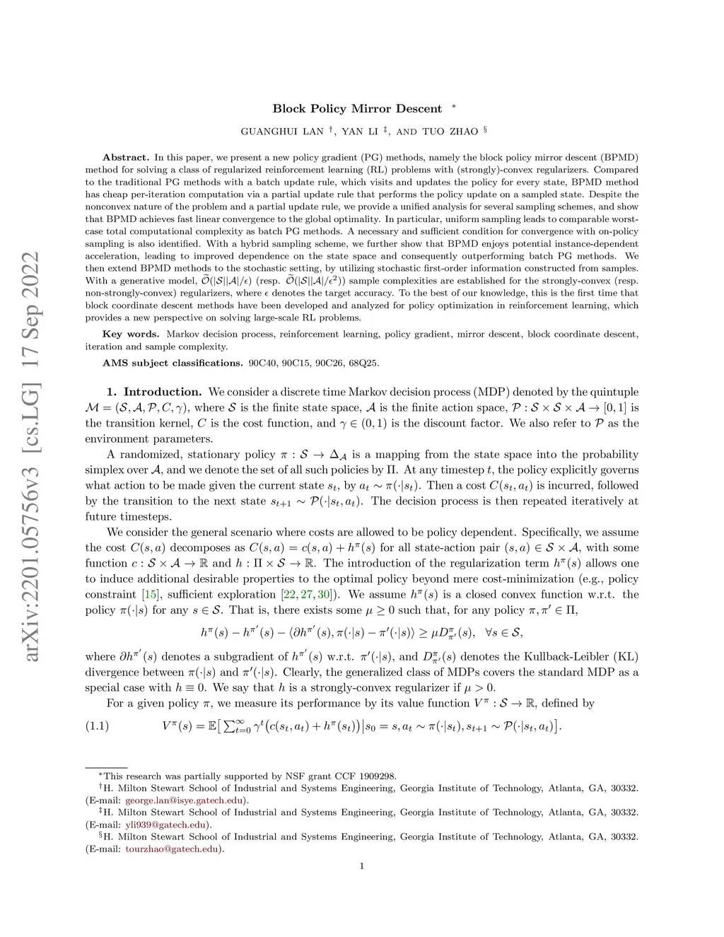 In this paper, we present a new policy gradient (PG) methods, namely the block policy mirror descent (BPMD) method for solving a class of regularized reinforcement learning (RL) problems with (strongly)-convex regularizers. Compared to the traditional PG methods with a batch update rule, which visits and updates the policy for every state, BPMD method has cheap per-iteration computation via a partial update rule that performs the policy update on a sampled state. Despite the nonconvex nature of the problem and a partial update rule, we provide a unified analysis for several sampling schemes, and show that BPMD achieves fast linear convergence to the global optimality. In particular, uniform sampling leads to comparable worst-case total computational complexity as batch PG methods. A necessary and sufficient condition for convergence with on-policy sampling is also identified. With a hybrid sampling scheme, we further show that BPMD enjoys potential instance-dependent acceleration, leading to improved dependence on the state space and consequently outperforming batch PG methods. We then extend BPMD methods to the stochastic setting, by utilizing stochastic first-order information constructed from samples. With a generative model, (resp. ) sample complexities are established for the strongly-convex (resp. non-strongly-convex) regularizers, where denotes the target accuracy. To the best of our knowledge, this is the first time that block coordinate descent methods have been developed and analyzed for policy optimization in reinforcement learning, which provides a new perspective on solving large-scale RL problems.