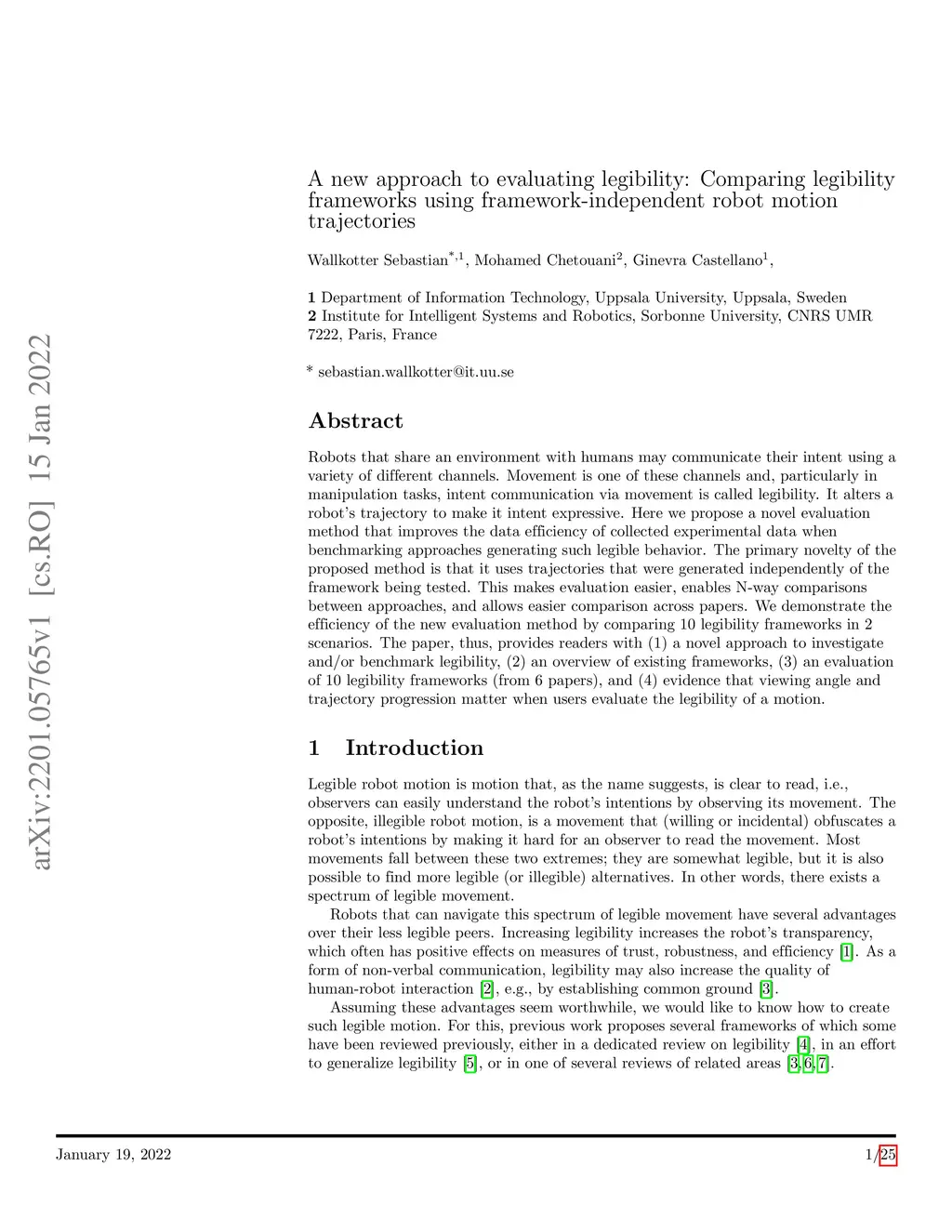 Robots that share an environment with humans may communicate their intent using a variety of different channels. Movement is one of these channels and, particularly in manipulation tasks, intent communication via movement is called legibility. It alters a robot's trajectory to make it intent expressive. Here we propose a novel evaluation method that improves the data efficiency of collected experimental data when benchmarking approaches generating such legible behavior. The primary novelty of the proposed method is that it uses trajectories that were generated independently of the framework being tested. This makes evaluation easier, enables N-way comparisons between approaches, and allows easier comparison across papers. We demonstrate the efficiency of the new evaluation method by comparing 10 legibility frameworks in 2 scenarios. The paper, thus, provides readers with (1) a novel approach to investigate and/or benchmark legibility, (2) an overview of existing frameworks, (3) an evaluation of 10 legibility frameworks (from 6 papers), and (4) evidence that viewing angle and trajectory progression matter when users evaluate the legibility of a motion.