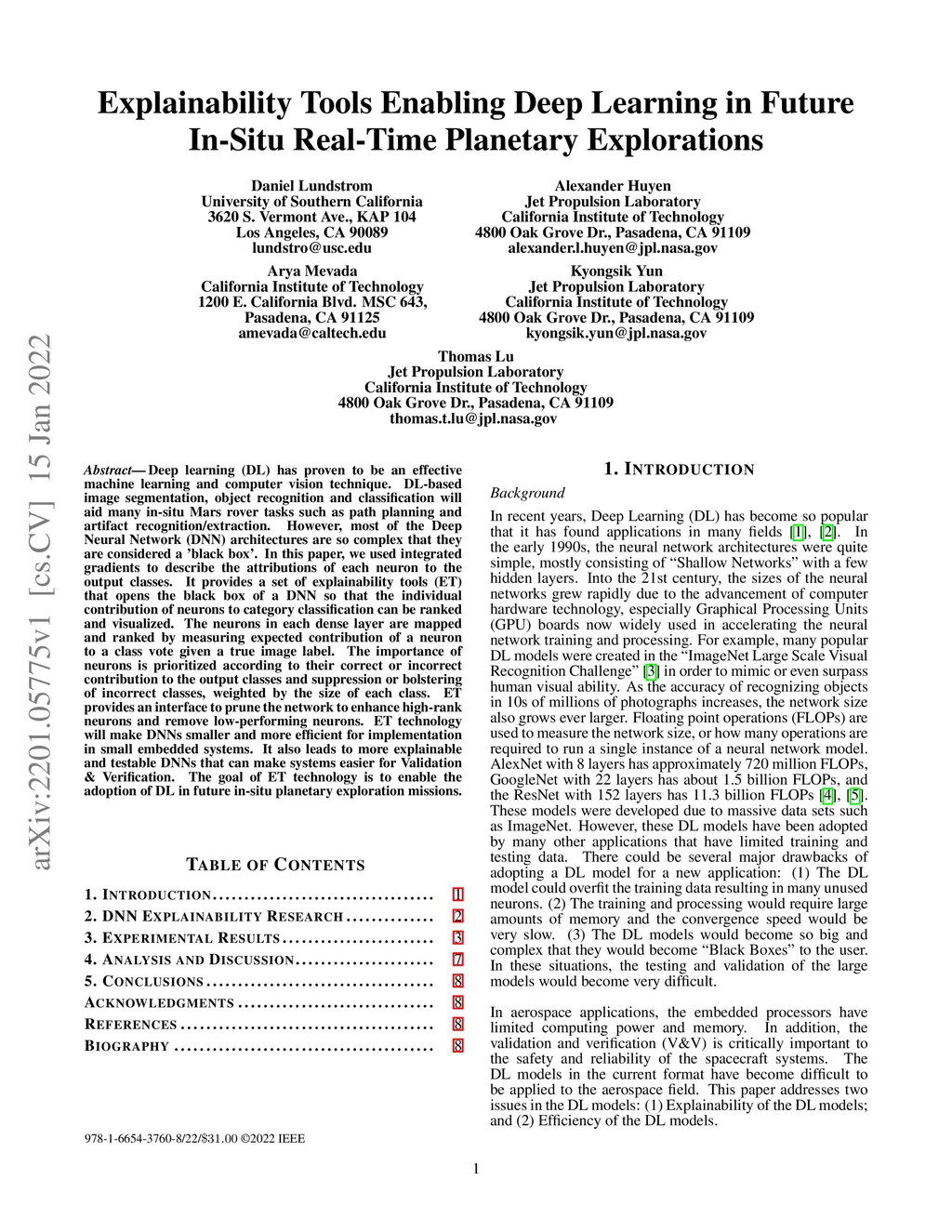 Deep learning (DL) has proven to be an effective machine learning and computer vision technique. DL-based image segmentation, object recognition and classification will aid many in-situ Mars rover tasks such as path planning and artifact recognition/extraction. However, most of the Deep Neural Network (DNN) architectures are so complex that they are considered a 'black box'. In this paper, we used integrated gradients to describe the attributions of each neuron to the output classes. It provides a set of explainability tools (ET) that opens the black box of a DNN so that the individual contribution of neurons to category classification can be ranked and visualized. The neurons in each dense layer are mapped and ranked by measuring expected contribution of a neuron to a class vote given a true image label. The importance of neurons is prioritized according to their correct or incorrect contribution to the output classes and suppression or bolstering of incorrect classes, weighted by the size of each class. ET provides an interface to prune the network to enhance high-rank neurons and remove low-performing neurons. ET technology will make DNNs smaller and more efficient for implementation in small embedded systems. It also leads to more explainable and testable DNNs that can make systems easier for Validation \& Verification. The goal of ET technology is to enable the adoption of DL in future in-situ planetary exploration missions.