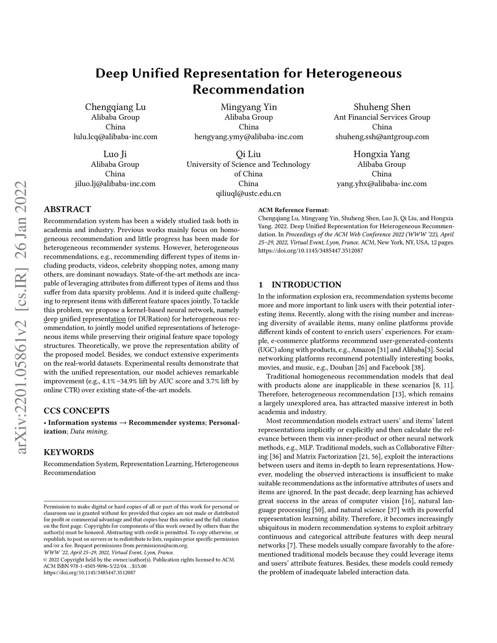 Recommendation system has been a widely studied task both in academia and industry. Previous works mainly focus on homogeneous recommendation and little progress has been made for heterogeneous recommender systems. However, heterogeneous recommendations, e.g., recommending different types of items including products, videos, celebrity shopping notes, among many others, are dominant nowadays. State-of-the-art methods are incapable of leveraging attributes from different types of items and thus suffer from data sparsity problems. And it is indeed quite challenging to represent items with different feature spaces jointly. To tackle this problem, we propose a kernel-based neural network, namely deep unified representation (or DURation) for heterogeneous recommendation, to jointly model unified representations of heterogeneous items while preserving their original feature space topology structures. Theoretically, we prove the representation ability of the proposed model. Besides, we conduct extensive experiments on real-world datasets. Experimental results demonstrate that with the unified representation, our model achieves remarkable improvement (e.g., 4.1% ~ 34.9% lift by AUC score and 3.7% lift by online CTR) over existing state-of-the-art models.