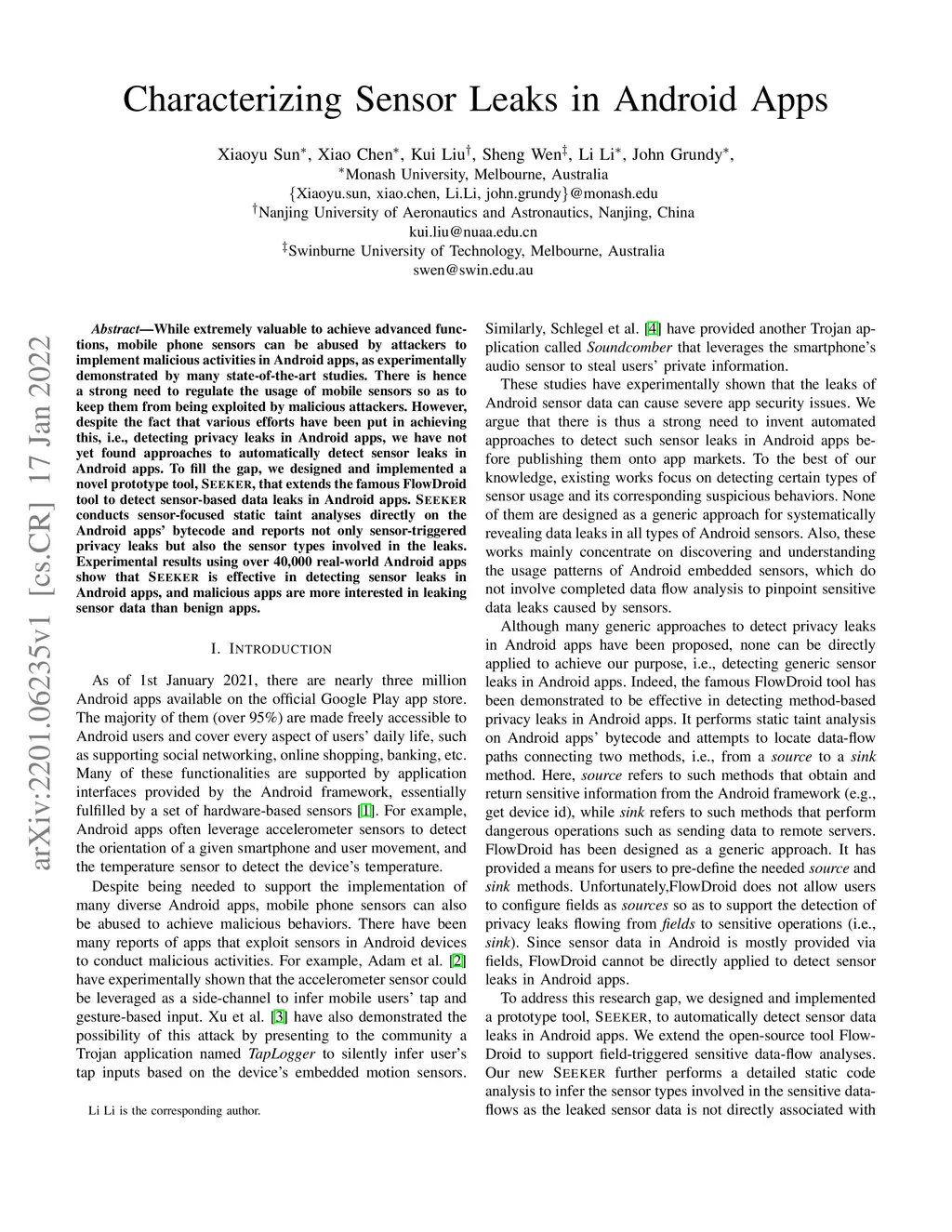 While extremely valuable to achieve advanced functions, mobile phone sensors can be abused by attackers to implement malicious activities in Android apps, as experimentally demonstrated by many state-of-the-art studies. There is hence a strong need to regulate the usage of mobile sensors so as to keep them from being exploited by malicious attackers. However, despite the fact that various efforts have been put in achieving this, i.e., detecting privacy leaks in Android apps, we have not yet found approaches to automatically detect sensor leaks in Android apps. To fill the gap, we designed and implemented a novel prototype tool, SEEKER, that extends the famous FlowDroid tool to detect sensor-based data leaks in Android apps. SEEKER conducts sensor-focused static taint analyses directly on the Android apps' bytecode and reports not only sensor-triggered privacy leaks but also the sensor types involved in the leaks. Experimental results using over 40,000 real-world Android apps show that SEEKER is effective in detecting sensor leaks in Android apps, and malicious apps are more interested in leaking sensor data than benign apps.