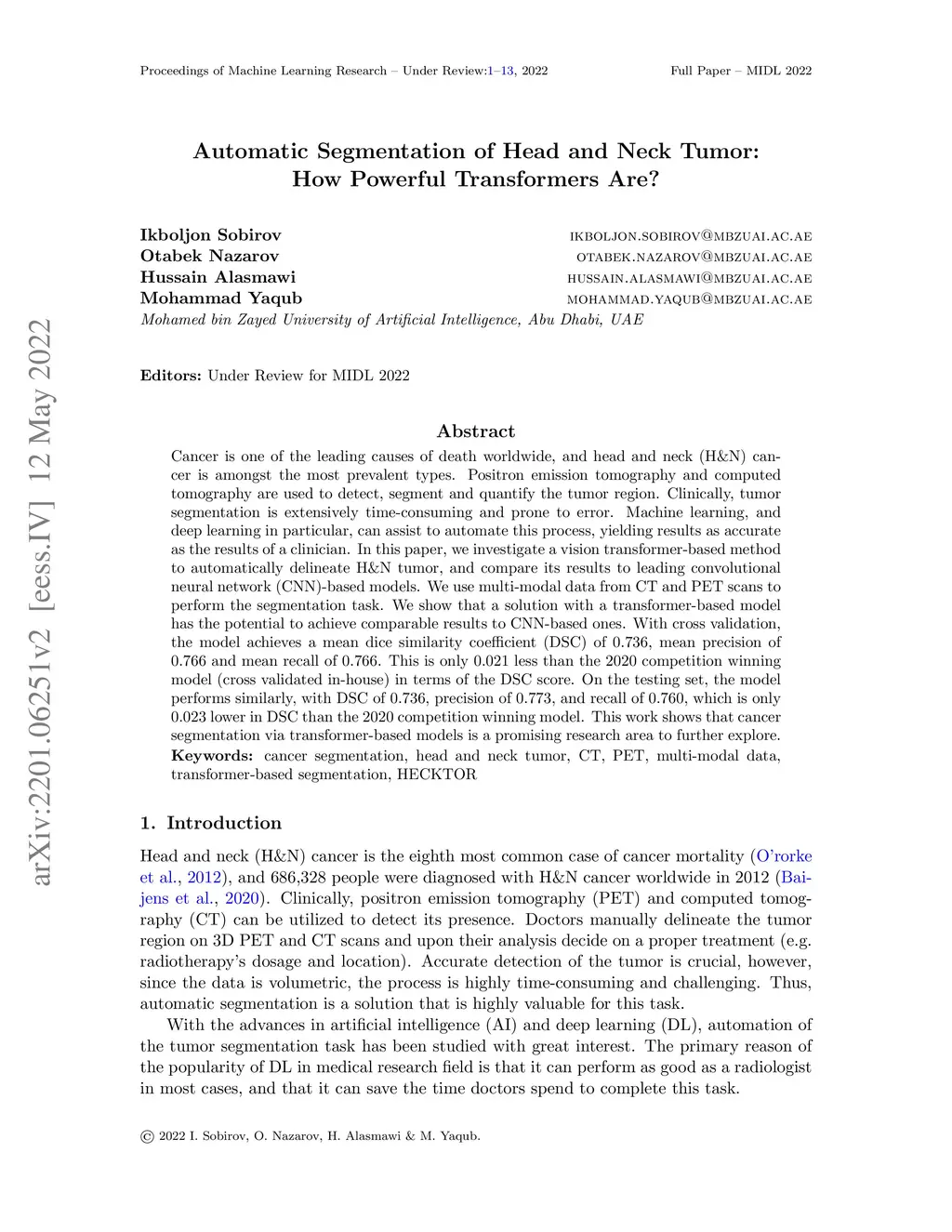 Cancer is one of the leading causes of death worldwide, and head and neck (H&N) cancer is amongst the most prevalent types. Positron emission tomography and computed tomography are used to detect, segment and quantify the tumor region. Clinically, tumor segmentation is extensively time-consuming and prone to error. Machine learning, and deep learning in particular, can assist to automate this process, yielding results as accurate as the results of a clinician. In this paper, we investigate a vision transformer-based method to automatically delineate H&N tumor, and compare its results to leading convolutional neural network (CNN)-based models. We use multi-modal data from CT and PET scans to perform the segmentation task. We show that a solution with a transformer-based model has the potential to achieve comparable results to CNN-based ones. With cross validation, the model achieves a mean dice similarity coefficient (DSC) of 0.736, mean precision of 0.766 and mean recall of 0.766. This is only 0.021 less than the 2020 competition winning model (cross validated in-house) in terms of the DSC score. On the testing set, the model performs similarly, with DSC of 0.736, precision of 0.773, and recall of 0.760, which is only 0.023 lower in DSC than the 2020 competition winning model. This work shows that cancer segmentation via transformer-based models is a promising research area to further explore.