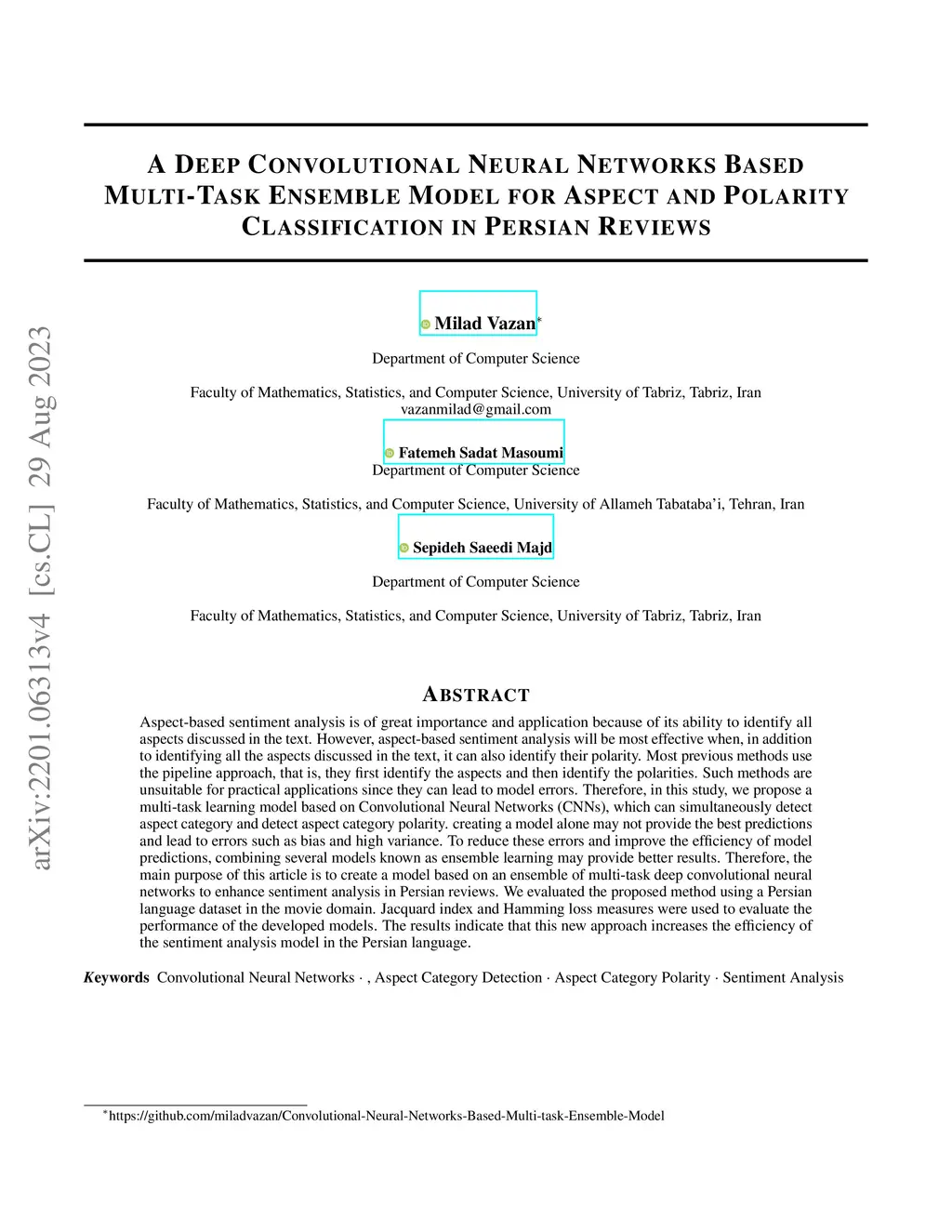 Aspect-based sentiment analysis is of great importance and application because of its ability to identify all aspects discussed in the text. However, aspect-based sentiment analysis will be most effective when, in addition to identifying all the aspects discussed in the text, it can also identify their polarity. Most previous methods use the pipeline approach, that is, they first identify the aspects and then identify the polarities. Such methods are unsuitable for practical applications since they can lead to model errors. Therefore, in this study, we propose a multi-task learning model based on Convolutional Neural Networks (CNNs), which can simultaneously detect aspect category and detect aspect category polarity. creating a model alone may not provide the best predictions and lead to errors such as bias and high variance. To reduce these errors and improve the efficiency of model predictions, combining several models known as ensemble learning may provide better results. Therefore, the main purpose of this article is to create a model based on an ensemble of multi-task deep convolutional neural networks to enhance sentiment analysis in Persian reviews. We evaluated the proposed method using a Persian language dataset in the movie domain. Jacquard index and Hamming loss measures were used to evaluate the performance of the developed models. The results indicate that this new approach increases the efficiency of the sentiment analysis model in the Persian language.