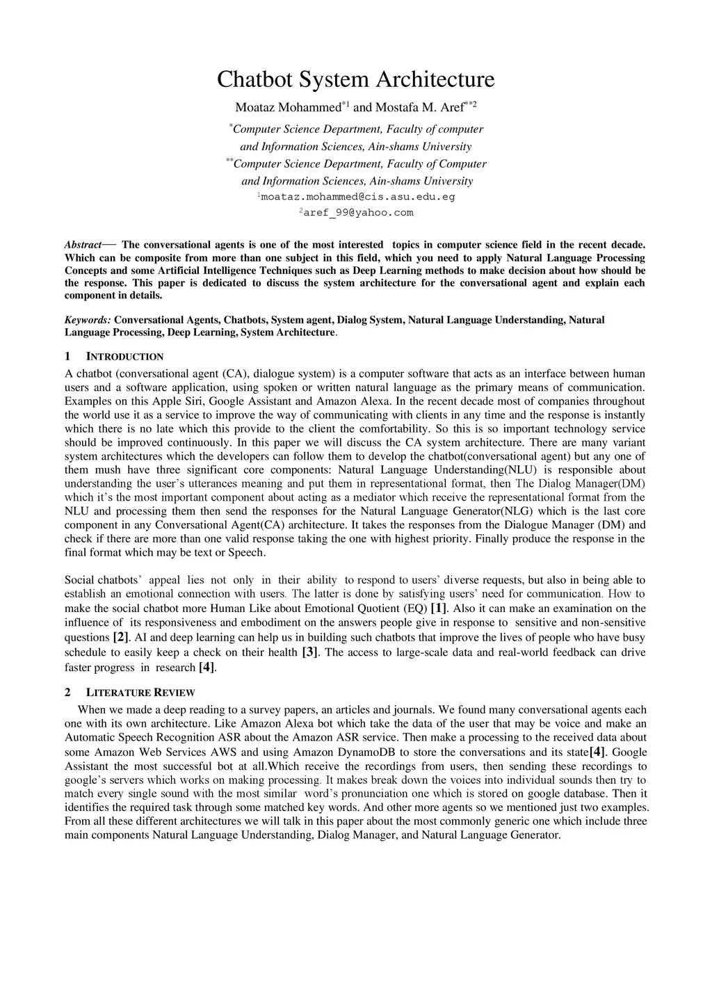 The conversational agents is one of the most interested topics in computer science field in the recent decade. Which can be composite from more than one subject in this field, which you need to apply Natural Language Processing Concepts and some Artificial Intelligence Techniques such as Deep Learning methods to make decision about how should be the response. This paper is dedicated to discuss the system architecture for the conversational agent and explain each component in details.