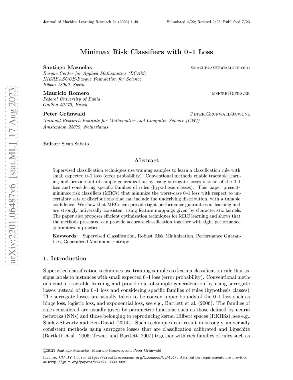 Supervised classification techniques use training samples to learn a classification rule with small expected 0-1 loss (error probability). Conventional methods enable tractable learning and provide out-of-sample generalization by using surrogate losses instead of the 0-1 loss and considering specific families of rules (hypothesis classes). This paper presents minimax risk classifiers (MRCs) that minize the worst-case 0-1 loss with respect to uncertainty sets of distributions that can include the underlying distribution, with a tunable confidence. We show that MRCs can provide tight performance guarantees at learning and are strongly universally consistent using feature mappings given by characteristic kernels. The paper also proposes efficient optimization techniques for MRC learning and shows that the methods presented can provide accurate classification together with tight performance guarantees in practice.