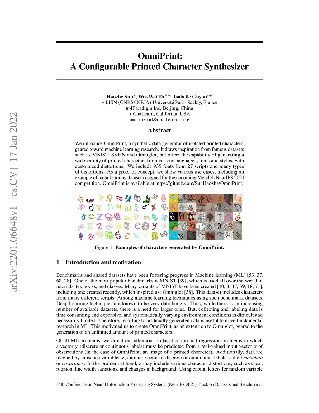 We introduce OmniPrint, a synthetic data generator of isolated printed characters, geared toward machine learning research. It draws inspiration from famous datasets such as MNIST, SVHN and Omniglot, but offers the capability of generating a wide variety of printed characters from various languages, fonts and styles, with customized distortions. We include 935 fonts from 27 scripts and many types of distortions. As a proof of concept, we show various use cases, including an example of meta-learning dataset designed for the upcoming MetaDL NeurIPS 2021 competition. OmniPrint is available at https://github.com/SunHaozhe/OmniPrint.