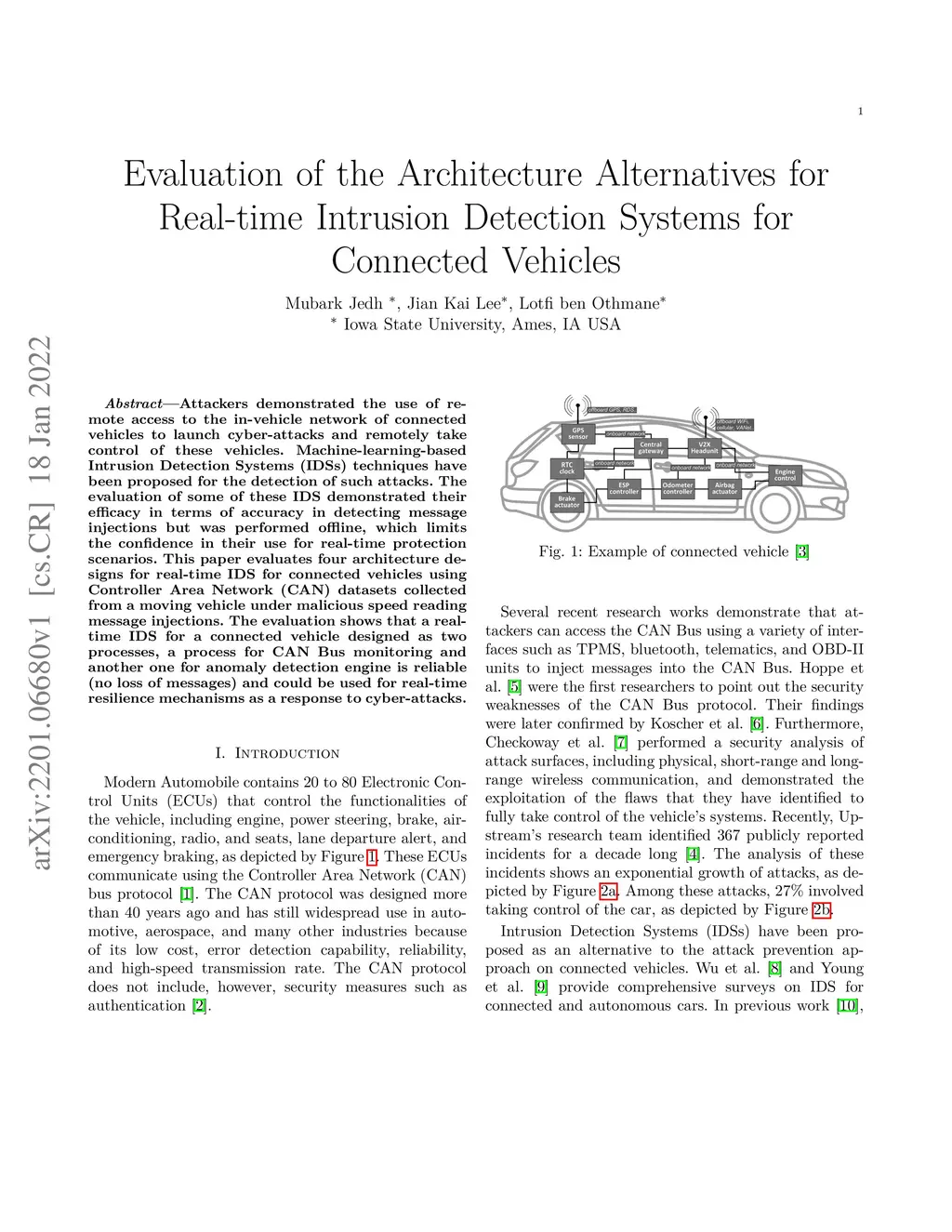 Attackers demonstrated the use of remote access to the in-vehicle network of connected vehicles to launch cyber-attacks and remotely take control of these vehicles. Machine-learning-based Intrusion Detection Systems (IDSs) techniques have been proposed for the detection of such attacks. The evaluation of some of these IDS demonstrated their efficacy in terms of accuracy in detecting message injections but was performed offline, which limits the confidence in their use for real-time protection scenarios. This paper evaluates four architecture designs for real-time IDS for connected vehicles using Controller Area Network (CAN) datasets collected from a moving vehicle under malicious speed reading message injections. The evaluation shows that a real-time IDS for a connected vehicle designed as two processes, a process for CAN Bus monitoring and another one for anomaly detection engine is reliable (no loss of messages) and could be used for real-time resilience mechanisms as a response to cyber-attacks.