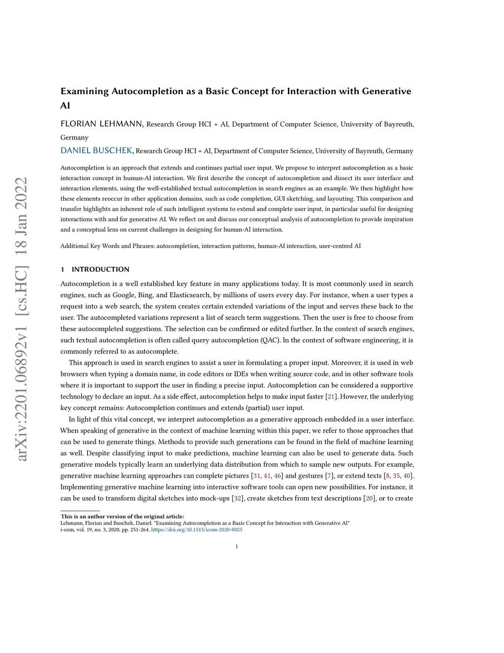 Autocompletion is an approach that extends and continues partial user input. We propose to interpret autocompletion as a basic interaction concept in human-AI interaction. We first describe the concept of autocompletion and dissect its user interface and interaction elements, using the well-established textual autocompletion in search engines as an example. We then highlight how these elements reoccur in other application domains, such as code completion, GUI sketching, and layouting. This comparison and transfer highlights an inherent role of such intelligent systems to extend and complete user input, in particular useful for designing interactions with and for generative AI. We reflect on and discuss our conceptual analysis of autocompletion to provide inspiration and a conceptual lens on current challenges in designing for human-AI interaction.