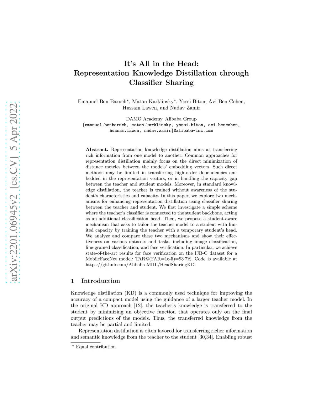 Representation knowledge distillation aims at transferring rich information from one model to another. Common approaches for representation distillation mainly focus on the direct minimization of distance metrics between the models' embedding vectors. Such direct methods may be limited in transferring high-order dependencies embedded in the representation vectors, or in handling the capacity gap between the teacher and student models. Moreover, in standard knowledge distillation, the teacher is trained without awareness of the student's characteristics and capacity. In this paper, we explore two mechanisms for enhancing representation distillation using classifier sharing between the teacher and student. We first investigate a simple scheme where the teacher's classifier is connected to the student backbone, acting as an additional classification head. Then, we propose a student-aware mechanism that asks to tailor the teacher model to a student with limited capacity by training the teacher with a temporary student's head. We analyze and compare these two mechanisms and show their effectiveness on various datasets and tasks, including image classification, fine-grained classification, and face verification. In particular, we achieve state-of-the-art results for face verification on the IJB-C dataset for a MobileFaceNet model: TAR@(FAR=1e-5)=93.7\%. Code is available at https://github.com/Alibaba-MIIL/HeadSharingKD.