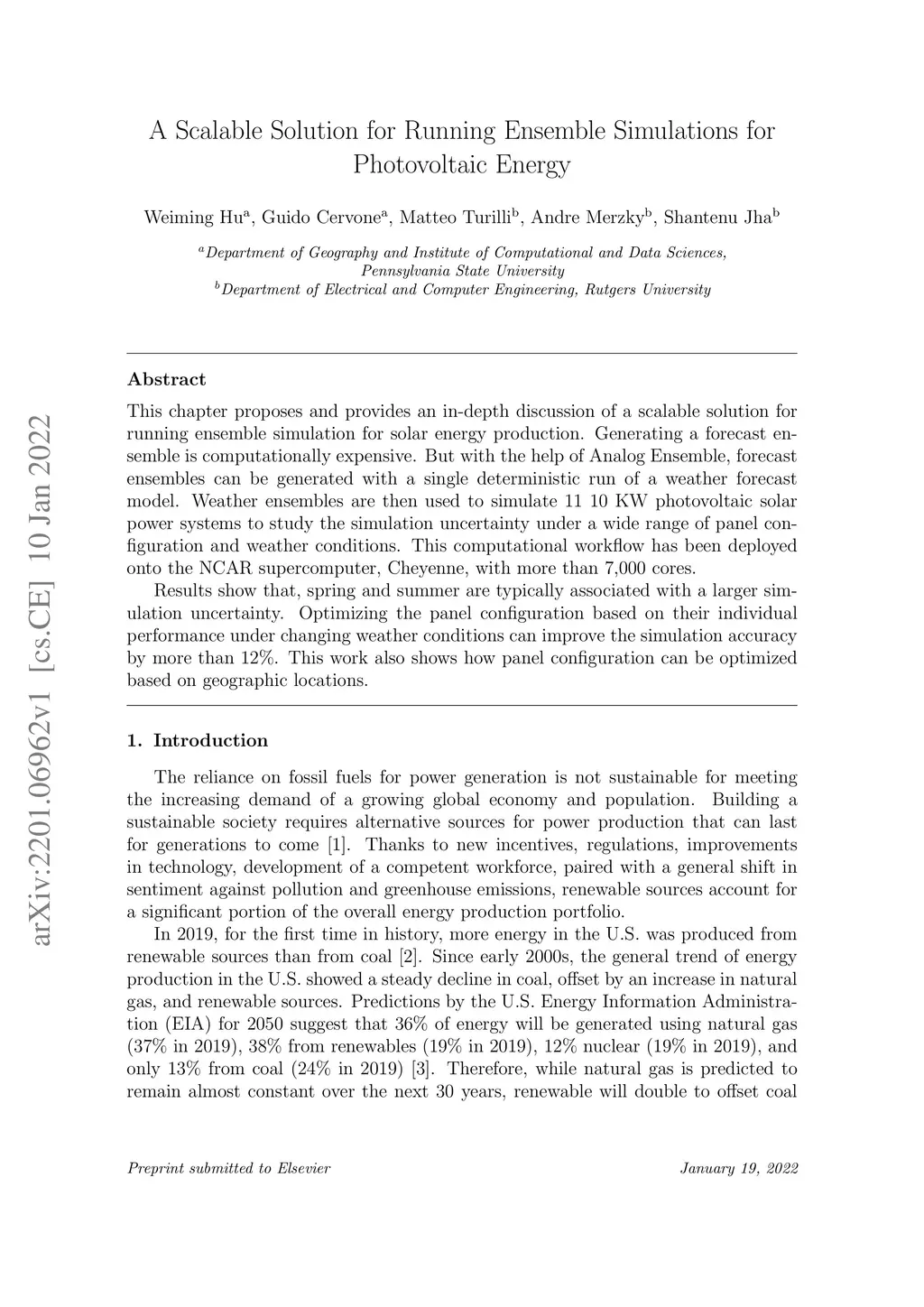 This chapter proposes and provides an in-depth discussion of a scalable solution for running ensemble simulation for solar energy production. Generating a forecast ensemble is computationally expensive. But with the help of Analog Ensemble, forecast ensembles can be generated with a single deterministic run of a weather forecast model. Weather ensembles are then used to simulate 11 10 KW photovoltaic solar power systems to study the simulation uncertainty under a wide range of panel configuration and weather conditions. This computational workflow has been deployed onto the NCAR supercomputer, Cheyenne, with more than 7,000 cores. Results show that, spring and summer are typically associated with a larger simulation uncertainty. Optimizing the panel configuration based on their individual performance under changing weather conditions can improve the simulation accuracy by more than 12%. This work also shows how panel configuration can be optimized based on geographic locations.