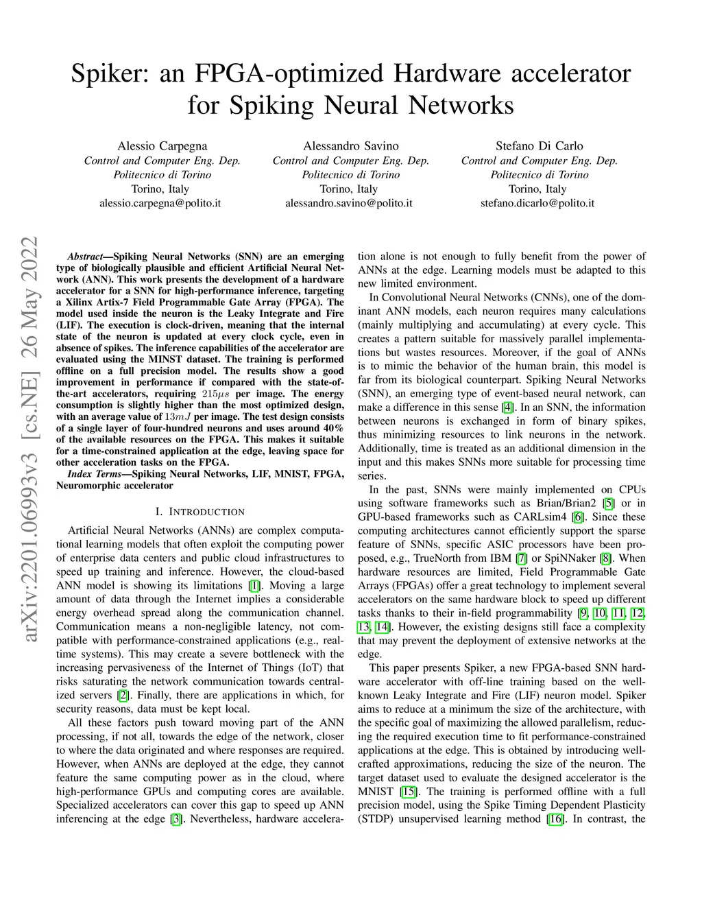 Spiking Neural Networks (SNN) are an emerging type of biologically plausible and efficient Artificial Neural Network (ANN). This work presents the development of a hardware accelerator for a SNN for high-performance inference, targeting a Xilinx Artix-7 Field Programmable Gate Array (FPGA). The model used inside the neuron is the Leaky Integrate and Fire (LIF). The execution is clock-driven, meaning that the internal state of the neuron is updated at every clock cycle, even in absence of spikes. The inference capabilities of the accelerator are evaluated using the MINST dataset. The training is performed offline on a full precision model. The results show a good improvement in performance if compared with the state-of-the-art accelerators, requiring 215{\mu}s per image. The energy consumption is slightly higher than the most optimized design, with an average value of 13mJ per image. The test design consists of a single layer of four-hundred neurons and uses around 40% of the available resources on the FPGA. This makes it suitable for a time-constrained application at the edge, leaving space for other acceleration tasks on the FPGA.