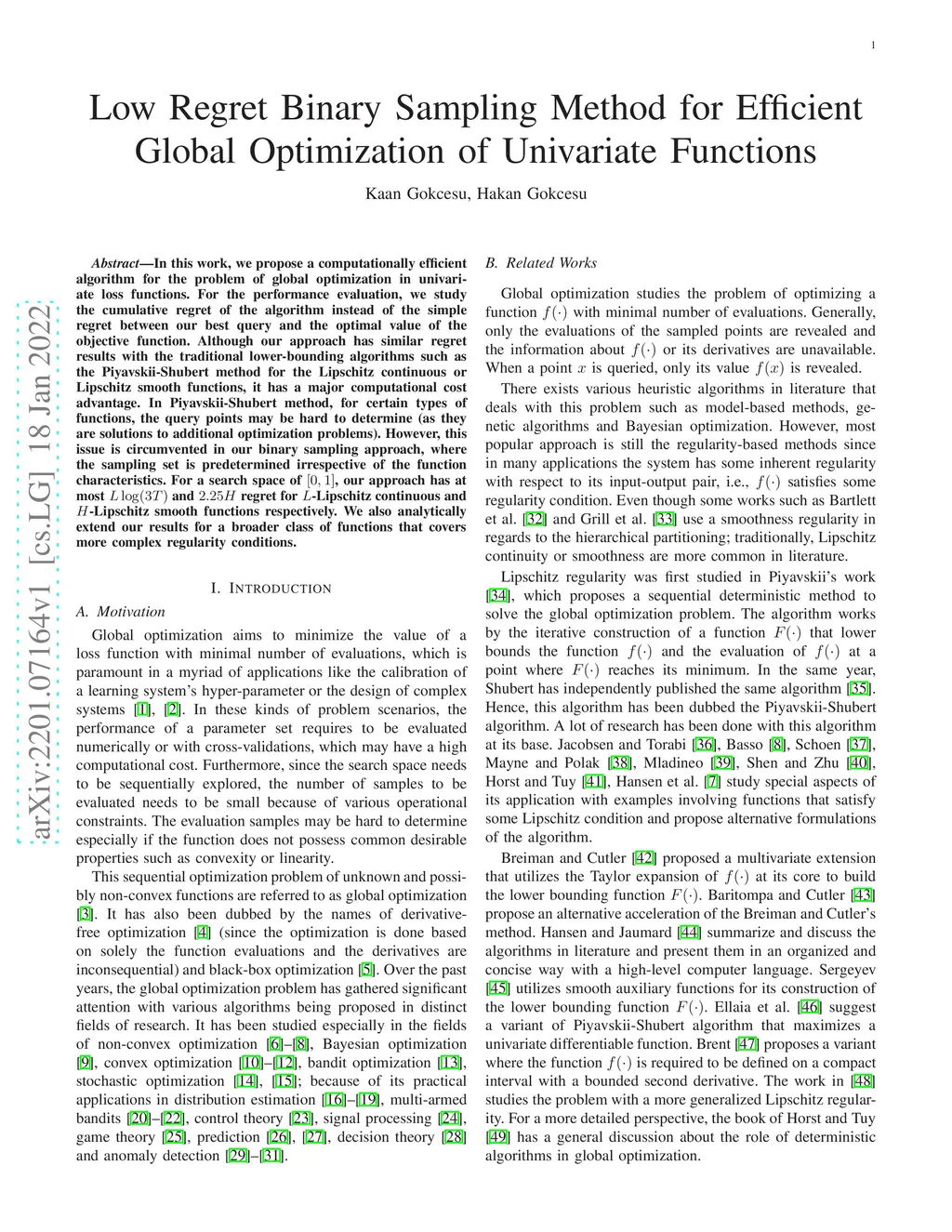 In this work, we propose a computationally efficient algorithm for the problem of global optimization in univariate loss functions. For the performance evaluation, we study the cumulative regret of the algorithm instead of the simple regret between our best query and the optimal value of the objective function. Although our approach has similar regret results with the traditional lower-bounding algorithms such as the Piyavskii-Shubert method for the Lipschitz continuous or Lipschitz smooth functions, it has a major computational cost advantage. In Piyavskii-Shubert method, for certain types of functions, the query points may be hard to determine (as they are solutions to additional optimization problems). However, this issue is circumvented in our binary sampling approach, where the sampling set is predetermined irrespective of the function characteristics. For a search space of , our approach has at most and regret for -Lipschitz continuous and -Lipschitz smooth functions respectively. We also analytically extend our results for a broader class of functions that covers more complex regularity conditions.
