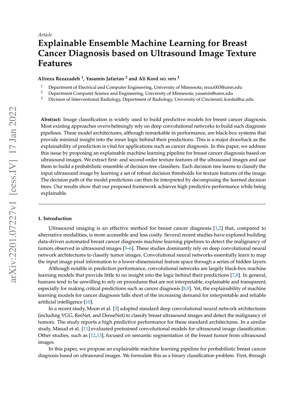Image classification is widely used to build predictive models for breast cancer diagnosis. Most existing approaches overwhelmingly rely on deep convolutional networks to build such diagnosis pipelines. These model architectures, although remarkable in performance, are black-box systems that provide minimal insight into the inner logic behind their predictions. This is a major drawback as the explainability of prediction is vital for applications such as cancer diagnosis. In this paper, we address this issue by proposing an explainable machine learning pipeline for breast cancer diagnosis based on ultrasound images. We extract first- and second-order texture features of the ultrasound images and use them to build a probabilistic ensemble of decision tree classifiers. Each decision tree learns to classify the input ultrasound image by learning a set of robust decision thresholds for texture features of the image. The decision path of the model predictions can then be interpreted by decomposing the learned decision trees. Our results show that our proposed framework achieves high predictive performance while being explainable.