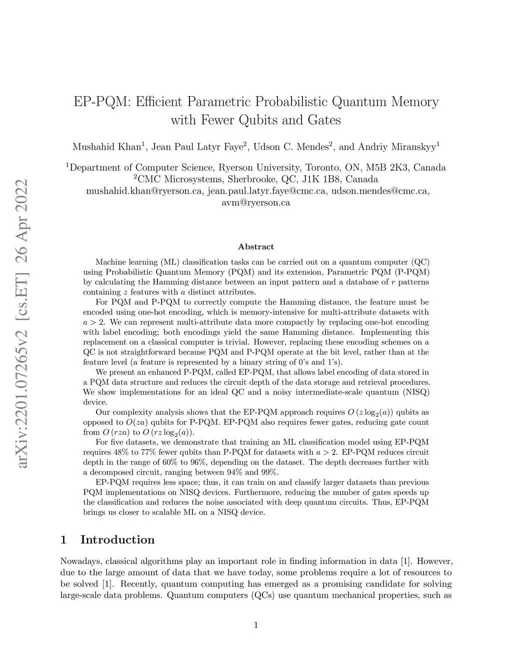 Machine learning (ML) classification tasks can be carried out on a quantum computer (QC) using Probabilistic Quantum Memory (PQM) and its extension, Parameteric PQM (P-PQM) by calculating the Hamming distance between an input pattern and a database of patterns containing features with distinct attributes. For accurate computations, the feature must be encoded using one-hot encoding, which is memory-intensive for multi-attribute datasets with . We can easily represent multi-attribute data more compactly on a classical computer by replacing one-hot encoding with label encoding. However, replacing these encoding schemes on a QC is not straightforward as PQM and P-PQM operate at the quantum bit level. We present an enhanced P-PQM, called EP-PQM, that allows label encoding of data stored in a PQM data structure and reduces the circuit depth of the data storage and retrieval procedures. We show implementations for an ideal QC and a noisy intermediate-scale quantum (NISQ) device. Our complexity analysis shows that the EP-PQM approach requires qubits as opposed to qubits for P-PQM. EP-PQM also requires fewer gates, reducing gate count from to . For five datasets, we demonstrate that training an ML classification model using EP-PQM requires 48% to 77% fewer qubits than P-PQM for datasets with . EP-PQM reduces circuit depth in the range of 60% to 96%, depending on the dataset. The depth decreases further with a decomposed circuit, ranging between 94% and 99%. EP-PQM requires less space; thus, it can train on and classify larger datasets than previous PQM implementations on NISQ devices. Furthermore, reducing the number of gates speeds up the classification and reduces the noise associated with deep quantum circuits. Thus, EP-PQM brings us closer to scalable ML on a NISQ device.
