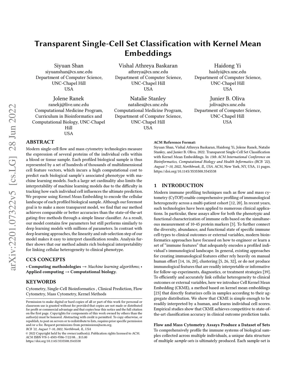 Modern single-cell flow and mass cytometry technologies measure the expression of several proteins of the individual cells within a blood or tissue sample. Each profiled biological sample is thus represented by a set of hundreds of thousands of multidimensional cell feature vectors, which incurs a high computational cost to predict each biological sample's associated phenotype with machine learning models. Such a large set cardinality also limits the interpretability of machine learning models due to the difficulty in tracking how each individual cell influences the ultimate prediction. We propose using Kernel Mean Embedding to encode the cellular landscape of each profiled biological sample. Although our foremost goal is to make a more transparent model, we find that our method achieves comparable or better accuracies than the state-of-the-art gating-free methods through a simple linear classifier. As a result, our model contains few parameters but still performs similarly to deep learning models with millions of parameters. In contrast with deep learning approaches, the linearity and sub-selection step of our model makes it easy to interpret classification results. Analysis further shows that our method admits rich biological interpretability for linking cellular heterogeneity to clinical phenotype.