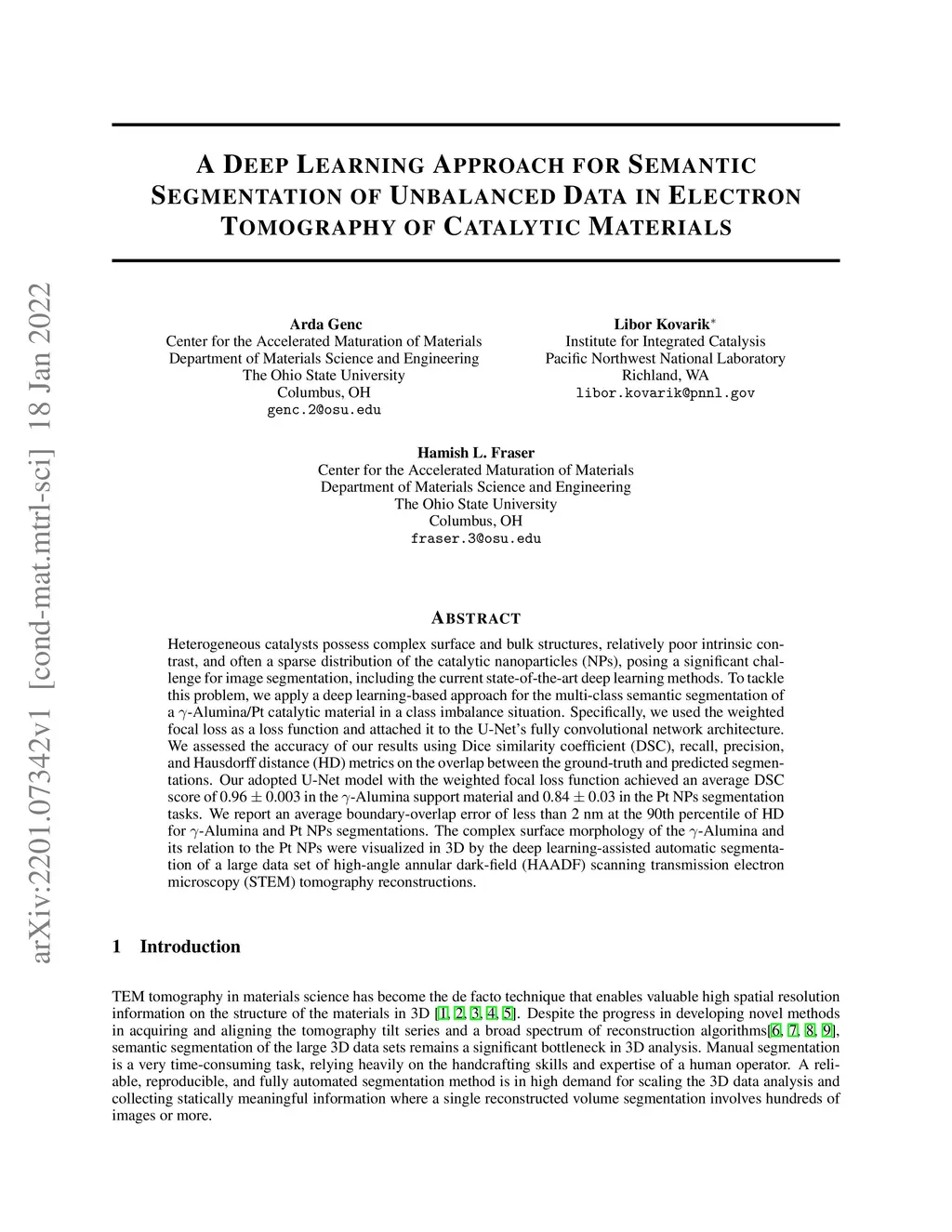 Heterogeneous catalysts possess complex surface and bulk structures, relatively poor intrinsic contrast, and often a sparse distribution of the catalytic nanoparticles (NPs), posing a significant challenge for image segmentation, including the current state-of-the-art deep learning methods. To tackle this problem, we apply a deep learning-based approach for the multi-class semantic segmentation of a -Alumina/Pt catalytic material in a class imbalance situation. Specifically, we used the weighted focal loss as a loss function and attached it to the U-Net's fully convolutional network architecture. We assessed the accuracy of our results using Dice similarity coefficient (DSC), recall, precision, and Hausdorff distance (HD) metrics on the overlap between the ground-truth and predicted segmentations. Our adopted U-Net model with the weighted focal loss function achieved an average DSC score of 0.96 0.003 in the -Alumina support material and 0.84 0.03 in the Pt NPs segmentation tasks. We report an average boundary-overlap error of less than 2 nm at the 90th percentile of HD for -Alumina and Pt NPs segmentations. The complex surface morphology of the -Alumina and its relation to the Pt NPs were visualized in 3D by the deep learning-assisted automatic segmentation of a large data set of high-angle annular dark-field (HAADF) scanning transmission electron microscopy (STEM) tomography reconstructions.