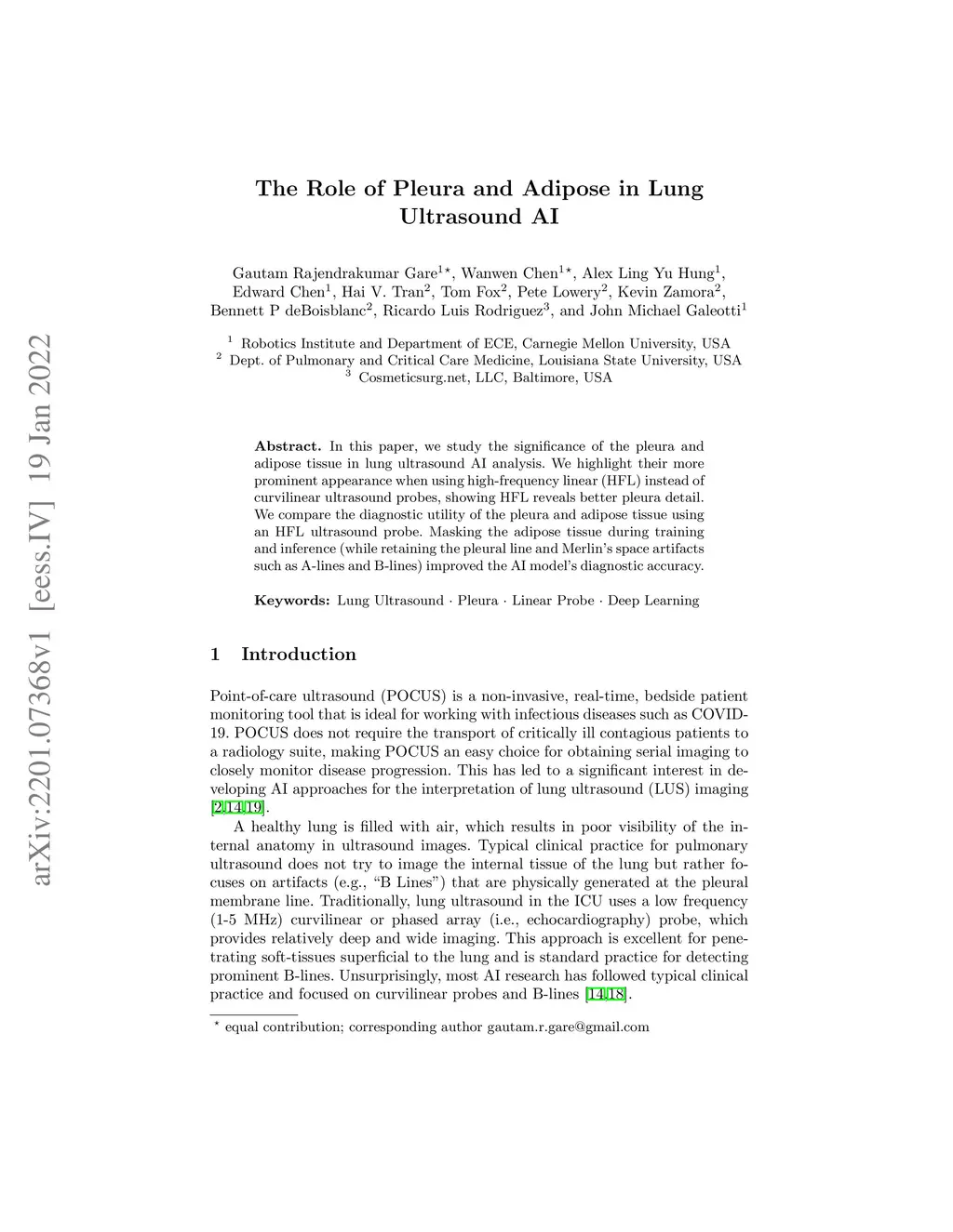 In this paper, we study the significance of the pleura and adipose tissue in lung ultrasound AI analysis. We highlight their more prominent appearance when using high-frequency linear (HFL) instead of curvilinear ultrasound probes, showing HFL reveals better pleura detail. We compare the diagnostic utility of the pleura and adipose tissue using an HFL ultrasound probe. Masking the adipose tissue during training and inference (while retaining the pleural line and Merlin's space artifacts such as A-lines and B-lines) improved the AI model's diagnostic accuracy.