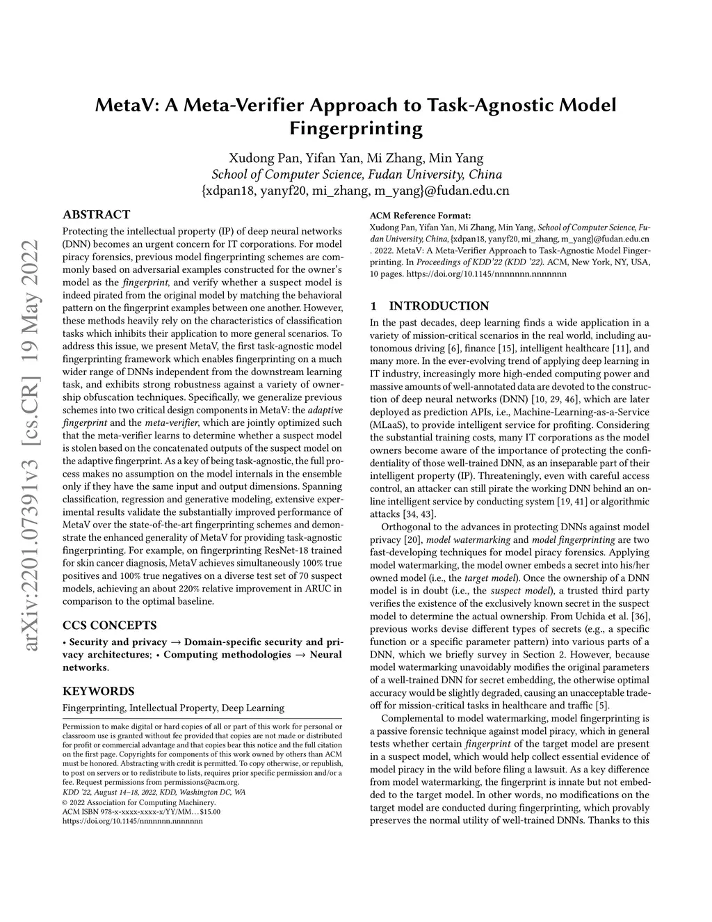 For model piracy forensics, previous model fingerprinting schemes are commonly based on adversarial examples constructed for the owner's model as the \textit{fingerprint}, and verify whether a suspect model is indeed pirated from the original model by matching the behavioral pattern on the fingerprint examples between one another. However, these methods heavily rely on the characteristics of classification tasks which inhibits their application to more general scenarios. To address this issue, we present MetaV, the first task-agnostic model fingerprinting framework which enables fingerprinting on a much wider range of DNNs independent from the downstream learning task, and exhibits strong robustness against a variety of ownership obfuscation techniques. Specifically, we generalize previous schemes into two critical design components in MetaV: the \textit{adaptive fingerprint} and the \textit{meta-verifier}, which are jointly optimized such that the meta-verifier learns to determine whether a suspect model is stolen based on the concatenated outputs of the suspect model on the adaptive fingerprint. As a key of being task-agnostic, the full process makes no assumption on the model internals in the ensemble only if they have the same input and output dimensions. Spanning classification, regression and generative modeling, extensive experimental results validate the substantially improved performance of MetaV over the state-of-the-art fingerprinting schemes and demonstrate the enhanced generality of MetaV for providing task-agnostic fingerprinting. For example, on fingerprinting ResNet-18 trained for skin cancer diagnosis, MetaV achieves simultaneously true positives and true negatives on a diverse test set of suspect models, achieving an about relative improvement in ARUC in comparison to the optimal baseline.