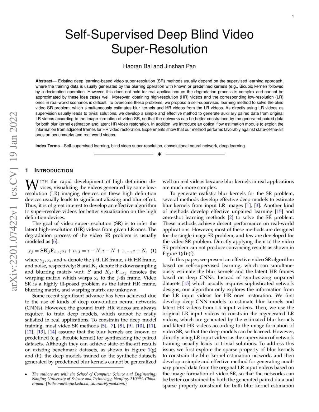 Existing deep learning-based video super-resolution (SR) methods usually depend on the supervised learning approach, where the training data is usually generated by the blurring operation with known or predefined kernels (e.g., Bicubic kernel) followed by a decimation operation. However, this does not hold for real applications as the degradation process is complex and cannot be approximated by these idea cases well. Moreover, obtaining high-resolution (HR) videos and the corresponding low-resolution (LR) ones in real-world scenarios is difficult. To overcome these problems, we propose a self-supervised learning method to solve the blind video SR problem, which simultaneously estimates blur kernels and HR videos from the LR videos. As directly using LR videos as supervision usually leads to trivial solutions, we develop a simple and effective method to generate auxiliary paired data from original LR videos according to the image formation of video SR, so that the networks can be better constrained by the generated paired data for both blur kernel estimation and latent HR video restoration. In addition, we introduce an optical flow estimation module to exploit the information from adjacent frames for HR video restoration. Experiments show that our method performs favorably against state-of-the-art ones on benchmarks and real-world videos.