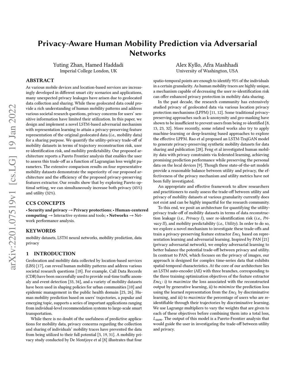 As various mobile devices and location-based services are increasingly developed in different smart city scenarios and applications, many unexpected privacy leakages have arisen due to geolocated data collection and sharing. While these geolocated data could provide a rich understanding of human mobility patterns and address various societal research questions, privacy concerns for users' sensitive information have limited their utilization. In this paper, we design and implement a novel LSTM-based adversarial mechanism with representation learning to attain a privacy-preserving feature representation of the original geolocated data (mobility data) for a sharing purpose. We quantify the utility-privacy trade-off of mobility datasets in terms of trajectory reconstruction risk, user re-identification risk, and mobility predictability. Our proposed architecture reports a Pareto Frontier analysis that enables the user to assess this trade-off as a function of Lagrangian loss weight parameters. The extensive comparison results on four representative mobility datasets demonstrate the superiority of our proposed architecture and the efficiency of the proposed privacy-preserving features extractor. Our results show that by exploring Pareto optimal setting, we can simultaneously increase both privacy (45%) and utility (32%).