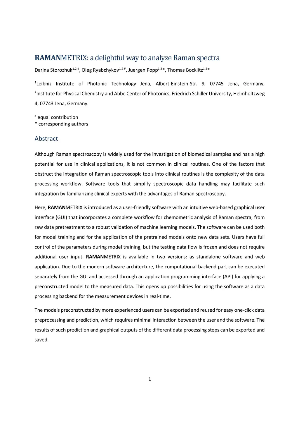 Although Raman spectroscopy is widely used for the investigation of biomedical samples and has a high potential for use in clinical applications, it is not common in clinical routines. One of the factors that obstruct the integration of Raman spectroscopic tools into clinical routines is the complexity of the data processing workflow. Software tools that simplify spectroscopic data handling may facilitate such integration by familiarizing clinical experts with the advantages of Raman spectroscopy. Here, RAMANMETRIX is introduced as a user-friendly software with an intuitive web-based graphical user interface (GUI) that incorporates a complete workflow for chemometric analysis of Raman spectra, from raw data pretreatment to a robust validation of machine learning models. The software can be used both for model training and for the application of the pretrained models onto new data sets. Users have full control of the parameters during model training, but the testing data flow is frozen and does not require additional user input. RAMANMETRIX is available in two versions: as standalone software and web application. Due to the modern software architecture, the computational backend part can be executed separately from the GUI and accessed through an application programming interface (API) for applying a preconstructed model to the measured data. This opens up possibilities for using the software as a data processing backend for the measurement devices in real-time. The models preconstructed by more experienced users can be exported and reused for easy one-click data preprocessing and prediction, which requires minimal interaction between the user and the software. The results of such prediction and graphical outputs of the different data processing steps can be exported and saved.