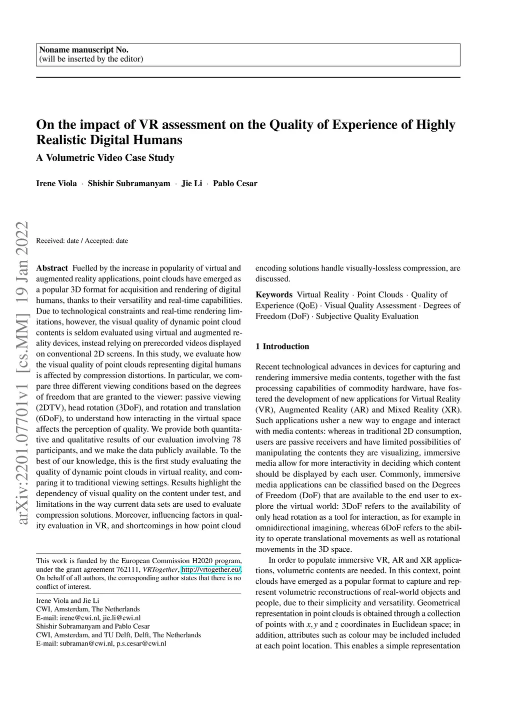 Fuelled by the increase in popularity of virtual and augmented reality applications, point clouds have emerged as a popular 3D format for acquisition and rendering of digital humans, thanks to their versatility and real-time capabilities. Due to technological constraints and real-time rendering limitations, however, the visual quality of dynamic point cloud contents is seldom evaluated using virtual and augmented reality devices, instead relying on prerecorded videos displayed on conventional 2D screens. In this study, we evaluate how the visual quality of point clouds representing digital humans is affected by compression distortions. In particular, we compare three different viewing conditions based on the degrees of freedom that are granted to the viewer: passive viewing (2DTV), head rotation (3DoF), and rotation and translation (6DoF), to understand how interacting in the virtual space affects the perception of quality. We provide both quantitative and qualitative results of our evaluation involving 78 participants, and we make the data publicly available. To the best of our knowledge, this is the first study evaluating the quality of dynamic point clouds in virtual reality, and comparing it to traditional viewing settings. Results highlight the dependency of visual quality on the content under test, and limitations in the way current data sets are used to evaluate compression solutions. Moreover, influencing factors in quality evaluation in VR, and shortcomings in how point cloud encoding solutions handle visually-lossless compression, are discussed.