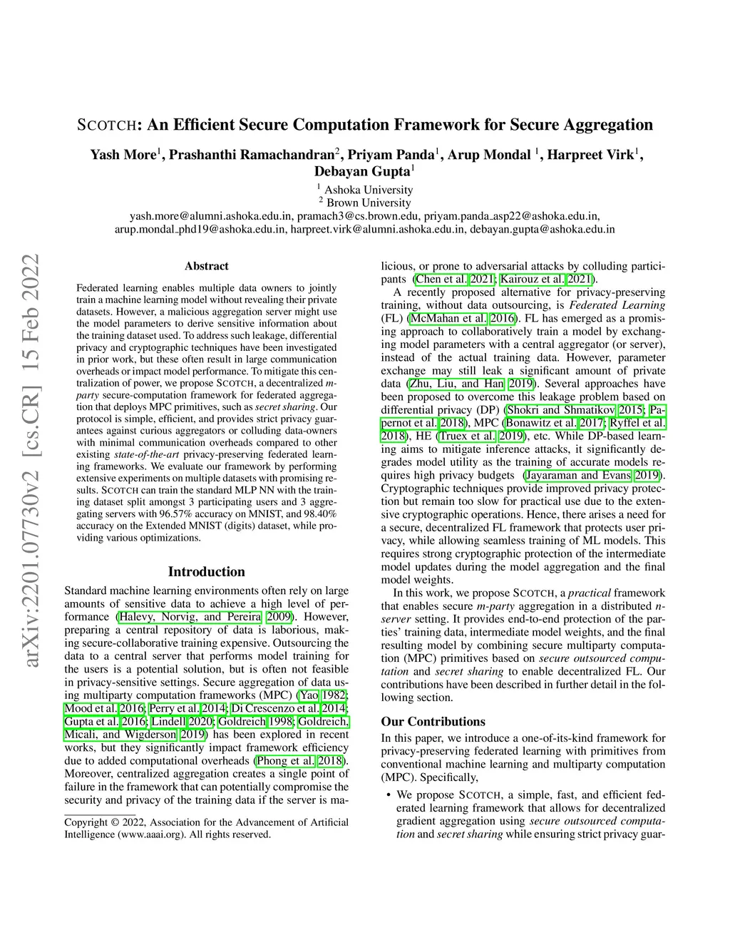 Federated learning enables multiple data owners to jointly train a machine learning model without revealing their private datasets. However, a malicious aggregation server might use the model parameters to derive sensitive information about the training dataset used. To address such leakage, differential privacy and cryptographic techniques have been investigated in prior work, but these often result in large communication overheads or impact model performance. To mitigate this centralization of power, we propose SCOTCH, a decentralized m-party secure-computation framework for federated aggregation that deploys MPC primitives, such as secret sharing. Our protocol is simple, efficient, and provides strict privacy guarantees against curious aggregators or colluding data-owners with minimal communication overheads compared to other existing state-of-the-art privacy-preserving federated learning frameworks. We evaluate our framework by performing extensive experiments on multiple datasets with promising results. SCOTCH can train the standard MLP NN with the training dataset split amongst 3 participating users and 3 aggregating servers with 96.57% accuracy on MNIST, and 98.40% accuracy on the Extended MNIST (digits) dataset, while providing various optimizations.