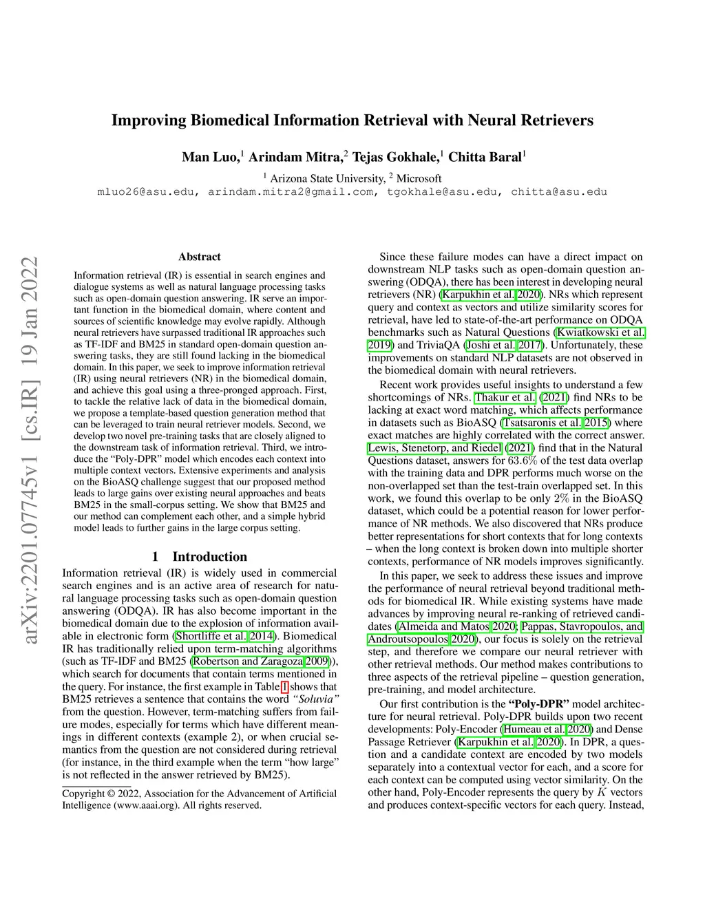 Information retrieval (IR) is essential in search engines and dialogue systems as well as natural language processing tasks such as open-domain question answering. IR serve an important function in the biomedical domain, where content and sources of scientific knowledge may evolve rapidly. Although neural retrievers have surpassed traditional IR approaches such as TF-IDF and BM25 in standard open-domain question answering tasks, they are still found lacking in the biomedical domain. In this paper, we seek to improve information retrieval (IR) using neural retrievers (NR) in the biomedical domain, and achieve this goal using a three-pronged approach. First, to tackle the relative lack of data in the biomedical domain, we propose a template-based question generation method that can be leveraged to train neural retriever models. Second, we develop two novel pre-training tasks that are closely aligned to the downstream task of information retrieval. Third, we introduce the ``Poly-DPR'' model which encodes each context into multiple context vectors. Extensive experiments and analysis on the BioASQ challenge suggest that our proposed method leads to large gains over existing neural approaches and beats BM25 in the small-corpus setting. We show that BM25 and our method can complement each other, and a simple hybrid model leads to further gains in the large corpus setting.