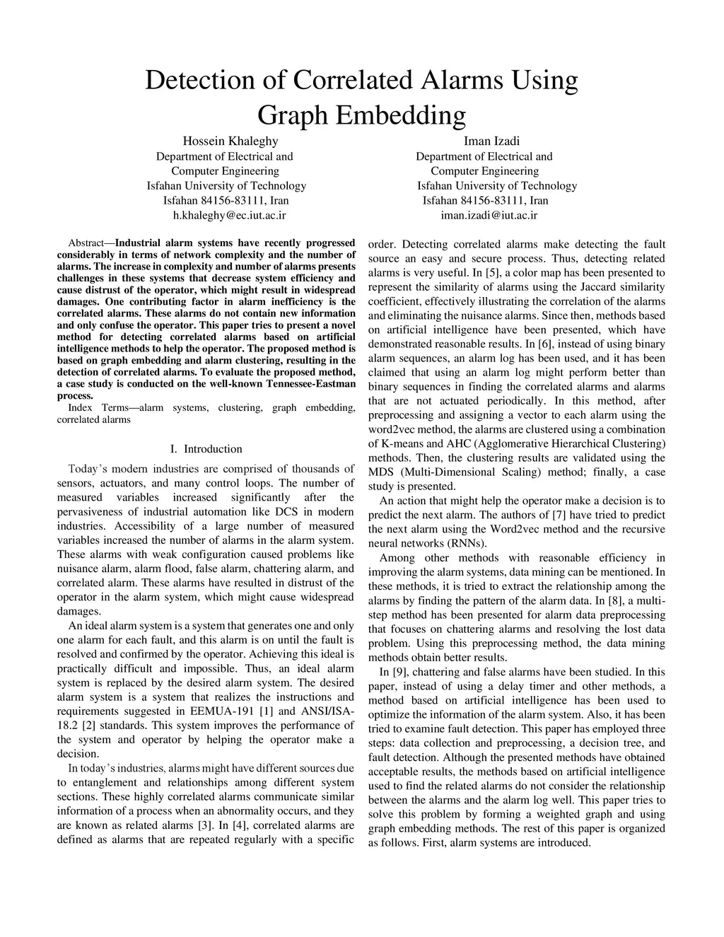 Industrial alarm systems have recently progressed considerably in terms of network complexity and the number of alarms. The increase in complexity and number of alarms presents challenges in these systems that decrease system efficiency and cause distrust of the operator, which might result in widespread damages. One contributing factor in alarm inefficiency is the correlated alarms. These alarms do not contain new information and only confuse the operator. This paper tries to present a novel method for detecting correlated alarms based on artificial intelligence methods to help the operator. The proposed method is based on graph embedding and alarm clustering, resulting in the detection of correlated alarms. To evaluate the proposed method, a case study is conducted on the well-known Tennessee-Eastman process.