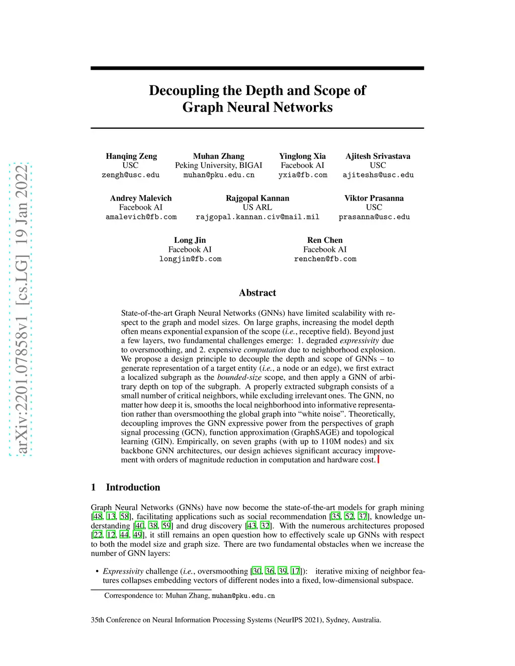 State-of-the-art Graph Neural Networks (GNNs) have limited scalability with respect to the graph and model sizes. On large graphs, increasing the model depth often means exponential expansion of the scope (i.e., receptive field). Beyond just a few layers, two fundamental challenges emerge: 1. degraded expressivity due to oversmoothing, and 2. expensive computation due to neighborhood explosion. We propose a design principle to decouple the depth and scope of GNNs -- to generate representation of a target entity (i.e., a node or an edge), we first extract a localized subgraph as the bounded-size scope, and then apply a GNN of arbitrary depth on top of the subgraph. A properly extracted subgraph consists of a small number of critical neighbors, while excluding irrelevant ones. The GNN, no matter how deep it is, smooths the local neighborhood into informative representation rather than oversmoothing the global graph into "white noise". Theoretically, decoupling improves the GNN expressive power from the perspectives of graph signal processing (GCN), function approximation (GraphSAGE) and topological learning (GIN). Empirically, on seven graphs (with up to 110M nodes) and six backbone GNN architectures, our design achieves significant accuracy improvement with orders of magnitude reduction in computation and hardware cost.