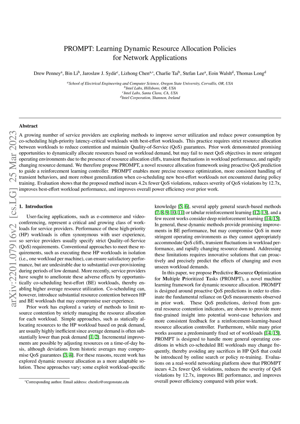 A growing number of service providers are exploring methods to improve server utilization and reduce power consumption by co-scheduling high-priority latency-critical workloads with best-effort workloads. This practice requires strict resource allocation between workloads to reduce contention and maintain Quality-of-Service (QoS) guarantees. Prior work demonstrated promising opportunities to dynamically allocate resources based on workload demand, but may fail to meet QoS objectives in more stringent operating environments due to the presence of resource allocation cliffs, transient fluctuations in workload performance, and rapidly changing resource demand. We therefore propose PROMPT, a novel resource allocation framework using proactive QoS prediction to guide a reinforcement learning controller. PROMPT enables more precise resource optimization, more consistent handling of transient behaviors, and more robust generalization when co-scheduling new best-effort workloads not encountered during policy training. Evaluation shows that the proposed method incurs 4.2x fewer QoS violations, reduces severity of QoS violations by 12.7x, improves best-effort workload performance, and improves overall power efficiency over prior work.