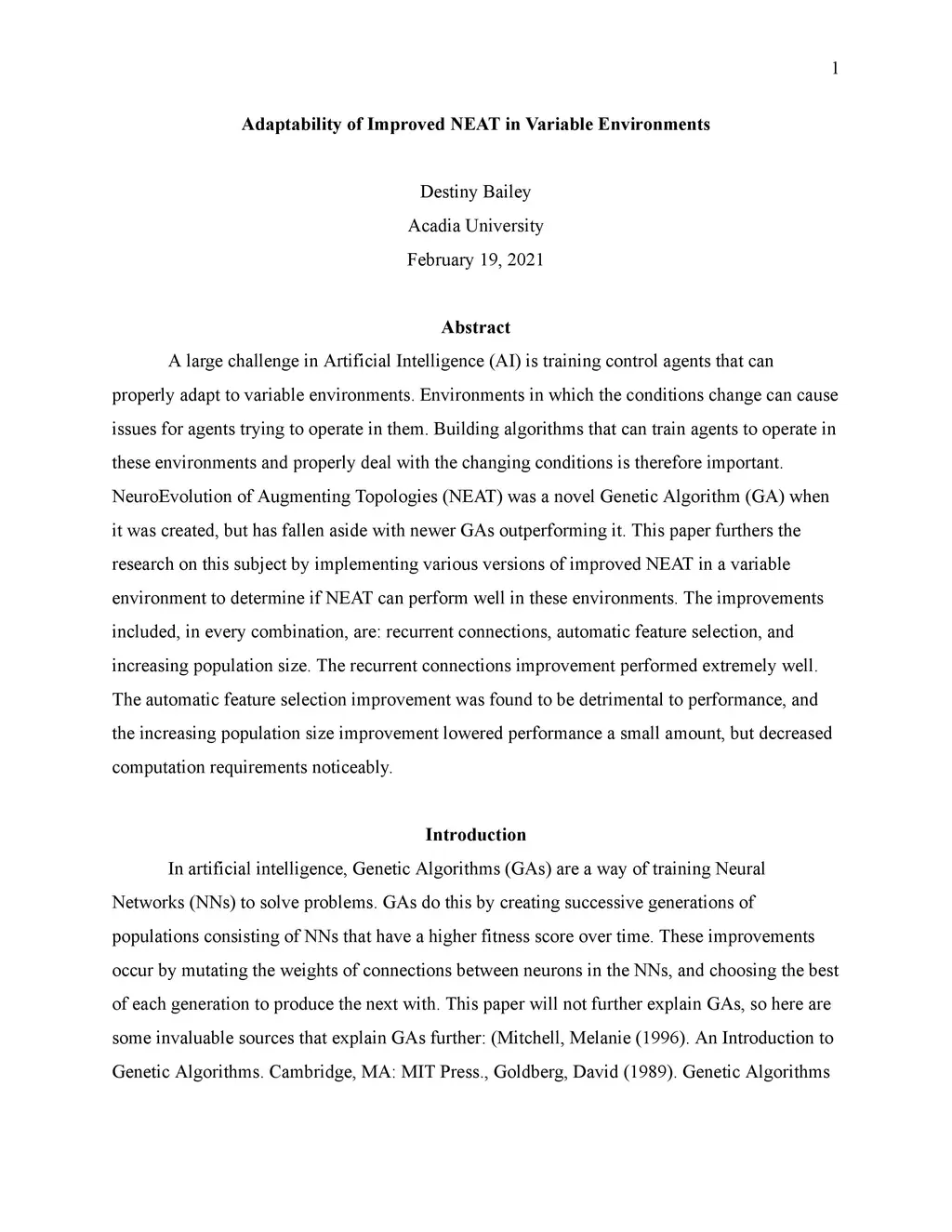 A large challenge in Artificial Intelligence (AI) is training control agents that can properly adapt to variable environments. Environments in which the conditions change can cause issues for agents trying to operate in them. Building algorithms that can train agents to operate in these environments and properly deal with the changing conditions is therefore important. NeuroEvolution of Augmenting Topologies (NEAT) was a novel Genetic Algorithm (GA) when it was created, but has fallen aside with newer GAs outperforming it. This paper furthers the research on this subject by implementing various versions of improved NEAT in a variable environment to determine if NEAT can perform well in these environments. The improvements included, in every combination, are: recurrent connections, automatic feature selection, and increasing population size. The recurrent connections improvement performed extremely well. The automatic feature selection improvement was found to be detrimental to performance, and the increasing population size improvement lowered performance a small amount, but decreased computation requirements noticeably.