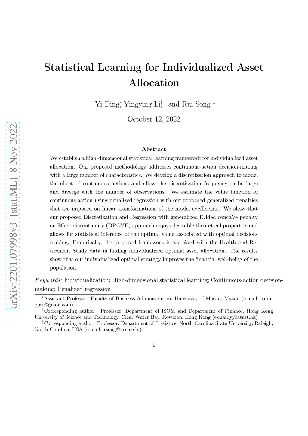We establish a high-dimensional statistical learning framework for individualized asset allocation. Our proposed methodology addresses continuous-action decision-making with a large number of characteristics. We develop a discretization approach to model the effect of continuous actions and allow the discretization frequency to be large and diverge with the number of observations. The value function of continuous-action is estimated using penalized regression with our proposed generalized penalties that are imposed on linear transformations of the model coefficients. We show that our proposed Discretization and Regression with generalized fOlded concaVe penalty on Effect discontinuity (DROVE) approach enjoys desirable theoretical properties and allows for statistical inference of the optimal value associated with optimal decision-making. Empirically, the proposed framework is exercised with the Health and Retirement Study data in finding individualized optimal asset allocation. The results show that our individualized optimal strategy improves the population financial well-being.