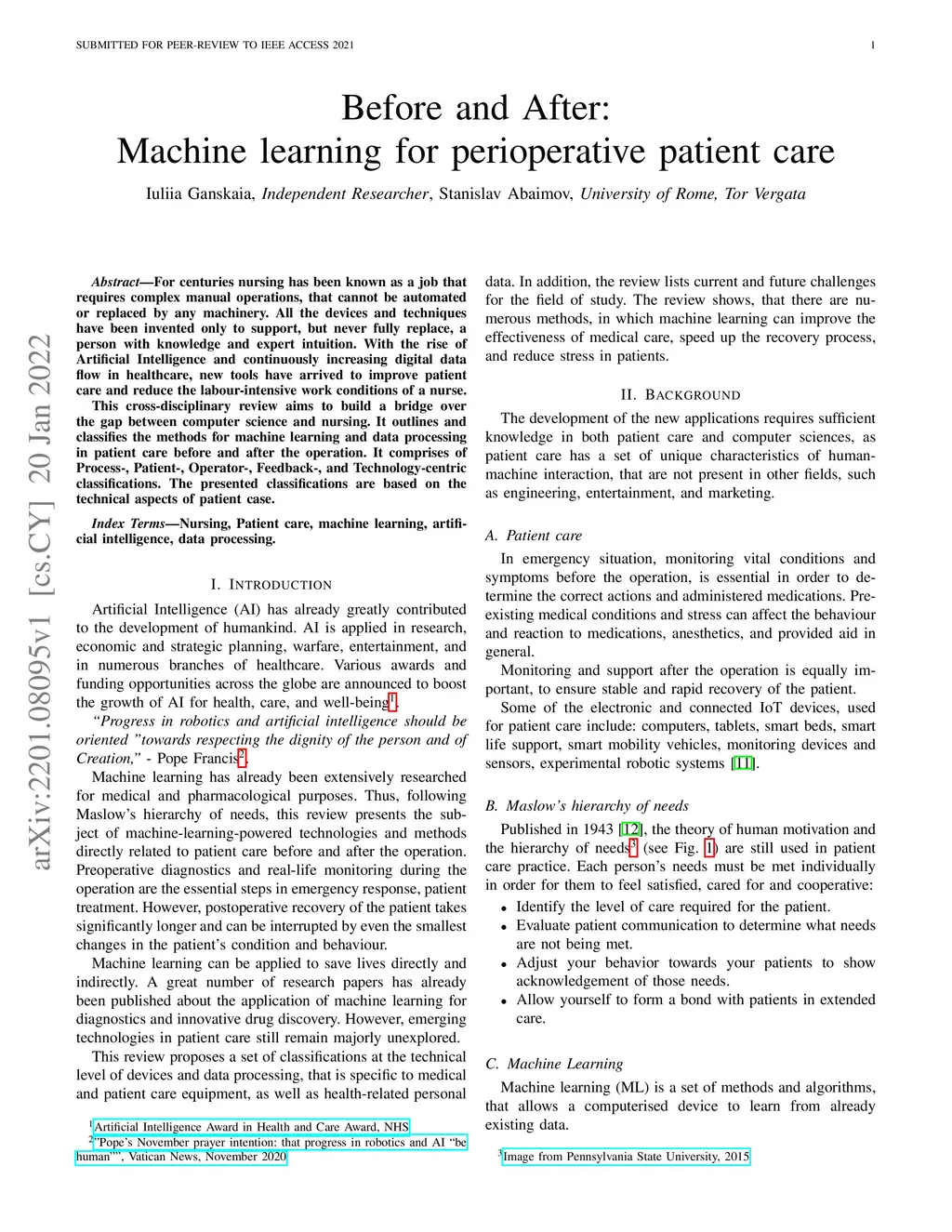 For centuries nursing has been known as a job that requires complex manual operations, that cannot be automated or replaced by any machinery. All the devices and techniques have been invented only to support, but never fully replace, a person with knowledge and expert intuition. With the rise of Artificial Intelligence and continuously increasing digital data flow in healthcare, new tools have arrived to improve patient care and reduce the labour-intensive work conditions of a nurse. This cross-disciplinary review aims to build a bridge over the gap between computer science and nursing. It outlines and classifies the methods for machine learning and data processing in patient care before and after the operation. It comprises of Process-, Patient-, Operator-, Feedback-, and Technology-centric classifications. The presented classifications are based on the technical aspects of patient case.