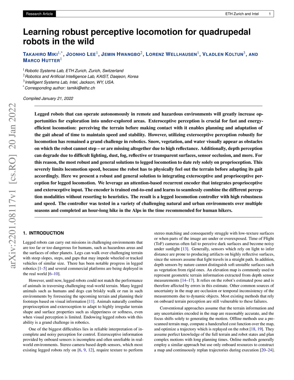 Legged robots that can operate autonomously in remote and hazardous environments will greatly increase opportunities for exploration into under-explored areas. Exteroceptive perception is crucial for fast and energy-efficient locomotion: perceiving the terrain before making contact with it enables planning and adaptation of the gait ahead of time to maintain speed and stability. However, utilizing exteroceptive perception robustly for locomotion has remained a grand challenge in robotics. Snow, vegetation, and water visually appear as obstacles on which the robot cannot step~-- or are missing altogether due to high reflectance. Additionally, depth perception can degrade due to difficult lighting, dust, fog, reflective or transparent surfaces, sensor occlusion, and more. For this reason, the most robust and general solutions to legged locomotion to date rely solely on proprioception. This severely limits locomotion speed, because the robot has to physically feel out the terrain before adapting its gait accordingly. Here we present a robust and general solution to integrating exteroceptive and proprioceptive perception for legged locomotion. We leverage an attention-based recurrent encoder that integrates proprioceptive and exteroceptive input. The encoder is trained end-to-end and learns to seamlessly combine the different perception modalities without resorting to heuristics. The result is a legged locomotion controller with high robustness and speed. The controller was tested in a variety of challenging natural and urban environments over multiple seasons and completed an hour-long hike in the Alps in the time recommended for human hikers.
