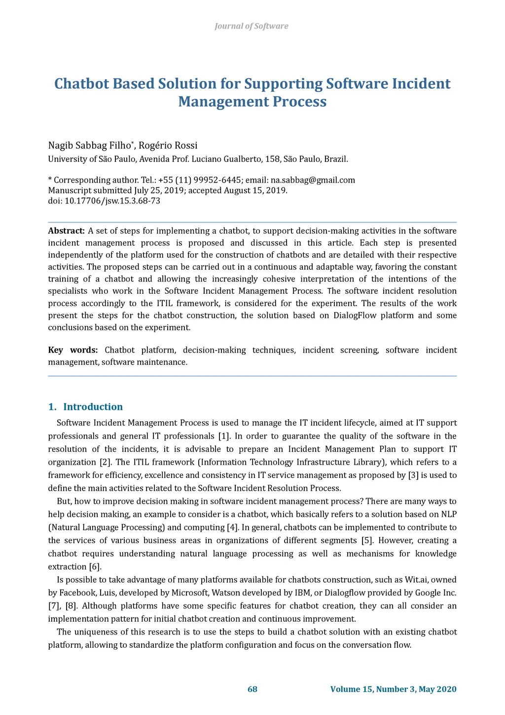 A set of steps for implementing a chatbot, to support decision-making activities in the software incident management process is proposed and discussed in this article. Each step is presented independently of the platform used for the construction of chatbots and are detailed with their respective activities. The proposed steps can be carried out in a continuous and adaptable way, favoring the constant training of a chatbot and allowing the increasingly cohesive interpretatin of the intentions of the specialists who work in the Software Incident Management Process. The software incident resolution process accordingly to the ITIL framework, is considered for the experiment. The results of the work present the steps for the chatbot construction, the solution based on DialogFlow platform and some conclusions based on the experiment.