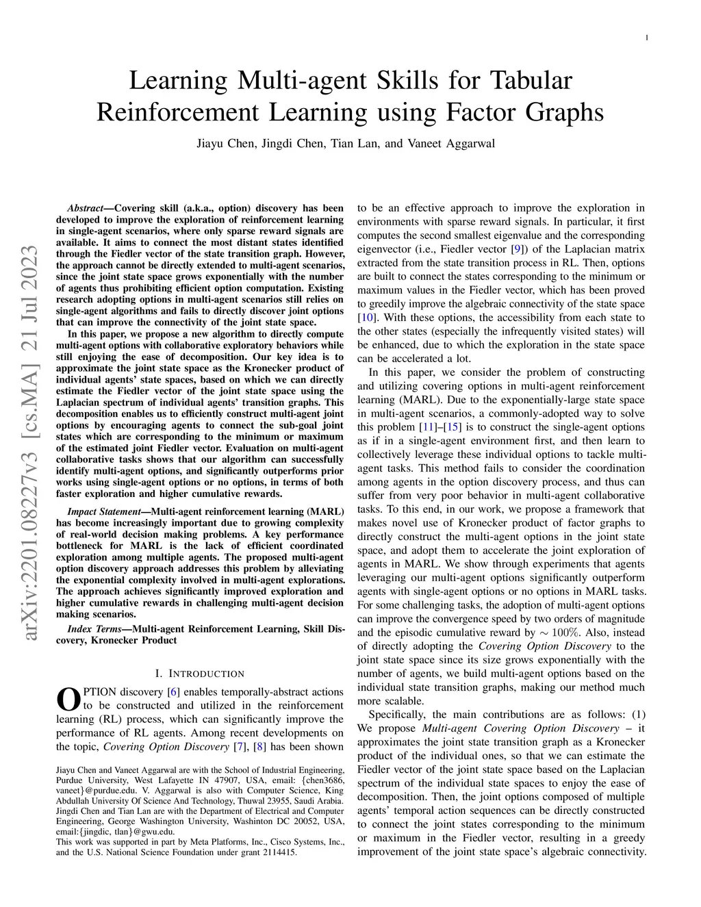 Covering skill (a.k.a., option) discovery has been developed to improve the exploration of reinforcement learning in single-agent scenarios with sparse reward signals, through connecting the most distant states in the embedding space provided by the Fiedler vector of the state transition graph. However, these option discovery methods cannot be directly extended to multi-agent scenarios, since the joint state space grows exponentially with the number of agents in the system. Thus, existing researches on adopting options in multi-agent scenarios still rely on single-agent option discovery and fail to directly discover the joint options that can improve the connectivity of the joint state space of agents. In this paper, we show that it is indeed possible to directly compute multi-agent options with collaborative exploratory behaviors among the agents, while still enjoying the ease of decomposition. Our key idea is to approximate the joint state space as a Kronecker graph -- the Kronecker product of individual agents' state transition graphs, based on which we can directly estimate the Fiedler vector of the joint state space using the Laplacian spectrum of individual agents' transition graphs. This decomposition enables us to efficiently construct multi-agent joint options by encouraging agents to connect the sub-goal joint states which are corresponding to the minimum or maximum values of the estimated joint Fiedler vector. The evaluation based on multi-agent collaborative tasks shows that the proposed algorithm can successfully identify multi-agent options, and significantly outperforms prior works using single-agent options or no options, in terms of both faster exploration and higher cumulative rewards.