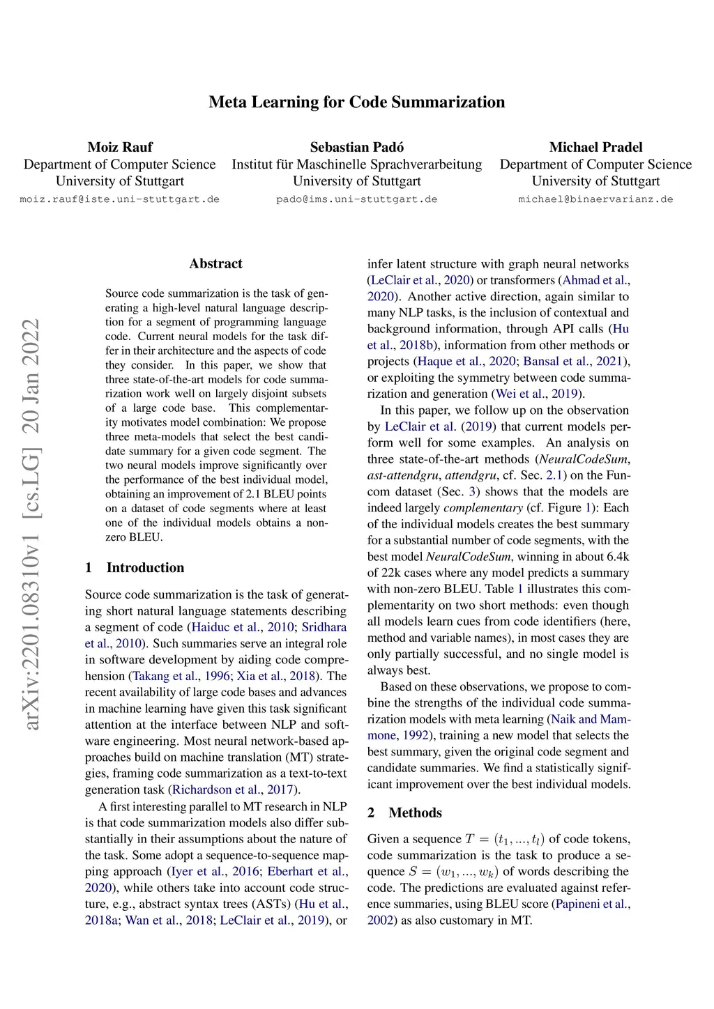 Source code summarization is the task of generating a high-level natural language description for a segment of programming language code. Current neural models for the task differ in their architecture and the aspects of code they consider. In this paper, we show that three SOTA models for code summarization work well on largely disjoint subsets of a large code-base. This complementarity motivates model combination: We propose three meta-models that select the best candidate summary for a given code segment. The two neural models improve significantly over the performance of the best individual model, obtaining an improvement of 2.1 BLEU points on a dataset of code segments where at least one of the individual models obtains a non-zero BLEU.