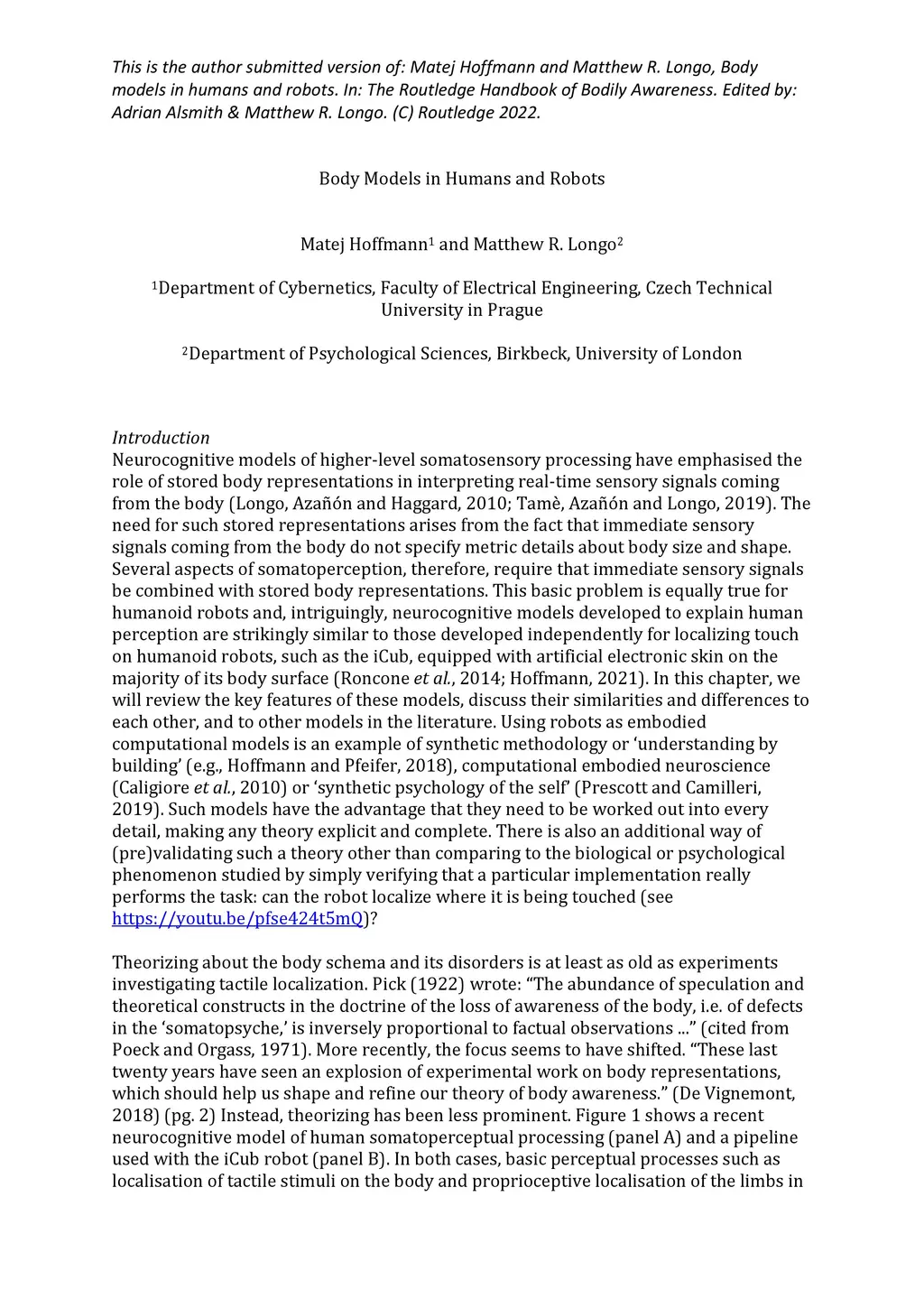 Neurocognitive models of higher-level somatosensory processing have emphasised the role of stored body representations in interpreting real-time sensory signals coming from the body (Longo, Azanon and Haggard, 2010; Tame, Azanon and Longo, 2019). The need for such stored representations arises from the fact that immediate sensory signals coming from the body do not specify metric details about body size and shape. Several aspects of somatoperception, therefore, require that immediate sensory signals be combined with stored body representations. This basic problem is equally true for humanoid robots and, intriguingly, neurocognitive models developed to explain human perception are strikingly similar to those developed independently for localizing touch on humanoid robots, such as the iCub, equipped with artificial electronic skin on the majority of its body surface (Roncone et al., 2014; Hoffmann, 2021). In this chapter, we will review the key features of these models, discuss their similarities and differences to each other, and to other models in the literature. Using robots as embodied computational models is an example of synthetic methodology or únderstanding by building' (e.g., Hoffmann and Pfeifer, 2018), computational embodied neuroscience (Caligiore et al., 2010) or 'synthetic psychology of the self' (Prescott and Camilleri, 2019). Such models have the advantage that they need to be worked out into every detail, making any theory explicit and complete. There is also an additional way of (pre)validating such a theory other than comparing to the biological or psychological phenomenon studied by simply verifying that a particular implementation really performs the task: can the robot localize where it is being touched (see https://youtu.be/pfse424t5mQ)?