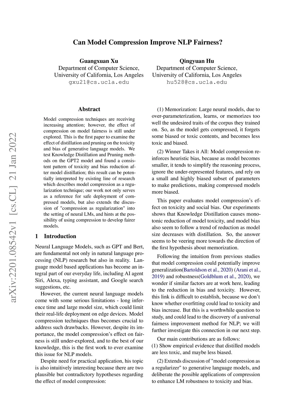 Model compression techniques are receiving increasing attention; however, the effect of compression on model fairness is still under explored. This is the first paper to examine the effect of distillation and pruning on the toxicity and bias of generative language models. We test Knowledge Distillation and Pruning methods on the GPT2 model and found a consistent pattern of toxicity and bias reduction after model distillation; this result can be potentially interpreted by existing line of research which describes model compression as a regularization technique; our work not only serves as a reference for safe deployment of compressed models, but also extends the discussion of "compression as regularization" into the setting of neural LMs, and hints at the possibility of using compression to develop fairer models.