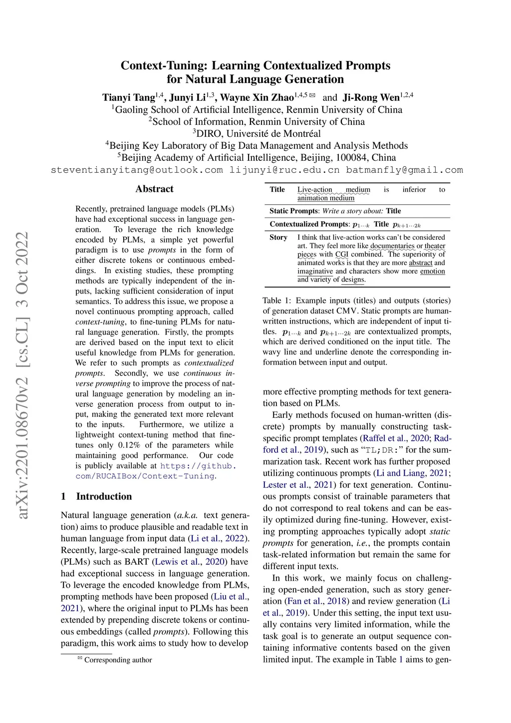 Recently, pretrained language models (PLMs) have had exceptional success in language generation. To leverage the rich knowledge encoded by PLMs, a simple yet powerful paradigm is to use prompts in the form of either discrete tokens or continuous embeddings. In existing studies, these prompting methods are typically independent of the inputs, lacking sufficient consideration of input semantics. To address this issue, we propose a novel continuous prompting approach, called context-tuning, to fine-tuning PLMs for natural language generation. Firstly, the prompts are derived based on the input text to elicit useful knowledge from PLMs for generation. We refer to such prompts as contextualized prompts. Secondly, we use continuous inverse prompting to improve the process of natural language generation by modeling an inverse generation process from output to input, making the generated text more relevant to the inputs. Furthermore, we utilize a lightweight context-tuning method that fine-tunes only 0.12% of the parameters while maintaining good performance. Our code is publicly available at https://github.com/RUCAIBox/Context-Tuning.