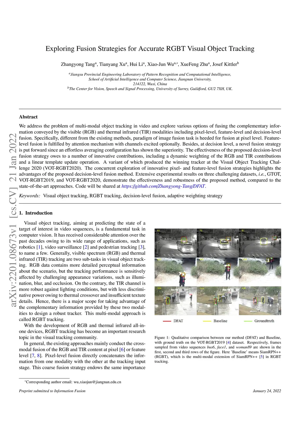 We address the problem of multi-modal object tracking in video and explore various options of fusing the complementary information conveyed by the visible (RGB) and thermal infrared (TIR) modalities including pixel-level, feature-level and decision-level fusion. Specifically, different from the existing methods, paradigm of image fusion task is heeded for fusion at pixel level. Feature-level fusion is fulfilled by attention mechanism with channels excited optionally. Besides, at decision level, a novel fusion strategy is put forward since an effortless averaging configuration has shown the superiority. The effectiveness of the proposed decision-level fusion strategy owes to a number of innovative contributions, including a dynamic weighting of the RGB and TIR contributions and a linear template update operation. A variant of which produced the winning tracker at the Visual Object Tracking Challenge 2020 (VOT-RGBT2020). The concurrent exploration of innovative pixel- and feature-level fusion strategies highlights the advantages of the proposed decision-level fusion method. Extensive experimental results on three challenging datasets, \textit{i.e.}, GTOT, VOT-RGBT2019, and VOT-RGBT2020, demonstrate the effectiveness and robustness of the proposed method, compared to the state-of-the-art approaches. Code will be shared at \textcolor{blue}{\emph{https://github.com/Zhangyong-Tang/DFAT}.