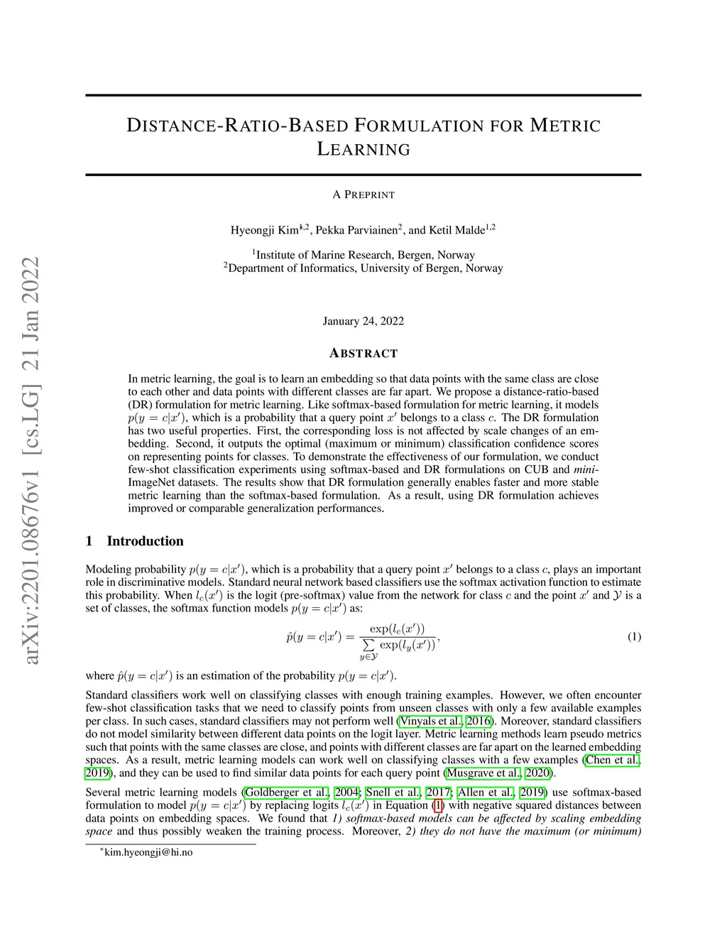 In metric learning, the goal is to learn an embedding so that data points with the same class are close to each other and data points with different classes are far apart. We propose a distance-ratio-based (DR) formulation for metric learning. Like softmax-based formulation for metric learning, it models , which is a probability that a query point belongs to a class . The DR formulation has two useful properties. First, the corresponding loss is not affected by scale changes of an embedding. Second, it outputs the optimal (maximum or minimum) classification confidence scores on representing points for classes. To demonstrate the effectiveness of our formulation, we conduct few-shot classification experiments using softmax-based and DR formulations on CUB and mini-ImageNet datasets. The results show that DR formulation generally enables faster and more stable metric learning than the softmax-based formulation. As a result, using DR formulation achieves improved or comparable generalization performances.