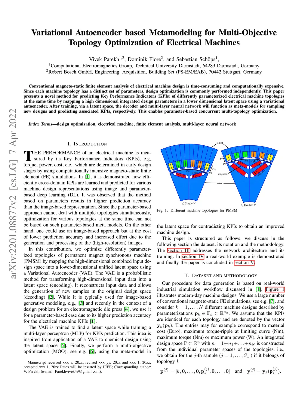 Conventional magneto-static finite element analysis of electrical machine design is time-consuming and computationally expensive. Since each machine topology has a distinct set of parameters, design optimization is commonly performed independently. This paper presents a novel method for predicting Key Performance Indicators (KPIs) of differently parameterized electrical machine topologies at the same time by mapping a high dimensional integrated design parameters in a lower dimensional latent space using a variational autoencoder. After training, via a latent space, the decoder and multi-layer neural network will function as meta-models for sampling new designs and predicting associated KPIs, respectively. This enables parameter-based concurrent multi-topology optimization.