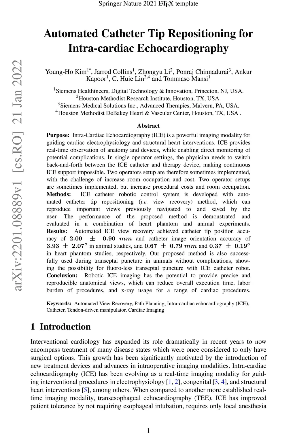 Purpose: Intra-Cardiac Echocardiography (ICE) is a powerful imaging modality for guiding cardiac electrophysiology and structural heart interventions. ICE provides real-time observation of anatomy and devices, while enabling direct monitoring of potential complications. In single operator settings, the physician needs to switch back-and-forth between the ICE catheter and therapy device, making continuous ICE support impossible. Two operators setup are therefore sometimes implemented, with the challenge of increase room occupation and cost. Two operator setups are sometimes implemented, but increase procedural costs and room occupation. Methods: ICE catheter robotic control system is developed with automated catheter tip repositioning (i.e. view recovery) method, which can reproduce important views previously navigated to and saved by the user. The performance of the proposed method is demonstrated and evaluated in a combination of heart phantom and animal experiments. Results: Automated ICE view recovery achieved catheter tip position accuracy of 2.09 +/-0.90 mm and catheter image orientation accuracy of 3.93 +/- 2.07 degree in animal studies, and 0.67 +/- 0.79 mm and 0.37 +/- 0.19 degree in heart phantom studies, respectively. Our proposed method is also successfully used during transeptal puncture in animals without complications, showing the possibility for fluoro-less transeptal puncture with ICE catheter robot. Conclusion: Robotic ICE imaging has the potential to provide precise and reproducible anatomical views, which can reduce overall execution time, labor burden of procedures, and x-ray usage for a range of cardiac procedures. Keywords: Automated View Recovery, Path Planning, Intra-cardiac echocardiography (ICE), Catheter, Tendon-driven manipulator, Cardiac Imaging
