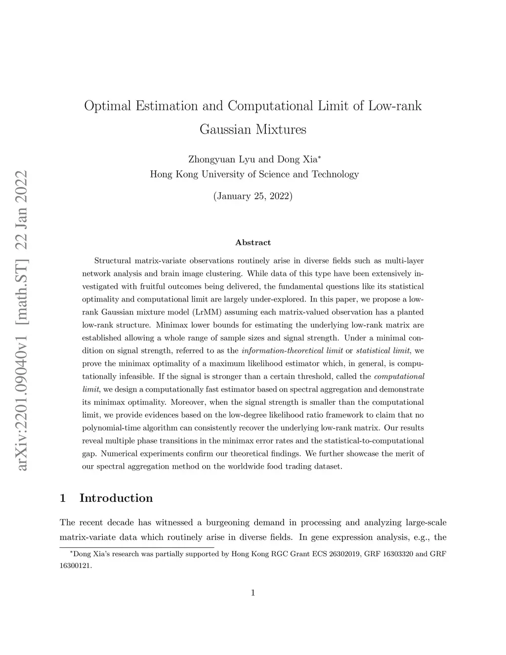 Structural matrix-variate observations routinely arise in diverse fields such as multi-layer network analysis and brain image clustering. While data of this type have been extensively investigated with fruitful outcomes being delivered, the fundamental questions like its statistical optimality and computational limit are largely under-explored. In this paper, we propose a low-rank Gaussian mixture model (LrMM) assuming each matrix-valued observation has a planted low-rank structure. Minimax lower bounds for estimating the underlying low-rank matrix are established allowing a whole range of sample sizes and signal strength. Under a minimal condition on signal strength, referred to as the information-theoretical limit or statistical limit, we prove the minimax optimality of a maximum likelihood estimator which, in general, is computationally infeasible. If the signal is stronger than a certain threshold, called the computational limit, we design a computationally fast estimator based on spectral aggregation and demonstrate its minimax optimality. Moreover, when the signal strength is smaller than the computational limit, we provide evidences based on the low-degree likelihood ratio framework to claim that no polynomial-time algorithm can consistently recover the underlying low-rank matrix. Our results reveal multiple phase transitions in the minimax error rates and the statistical-to-computational gap. Numerical experiments confirm our theoretical findings. We further showcase the merit of our spectral aggregation method on the worldwide food trading dataset.